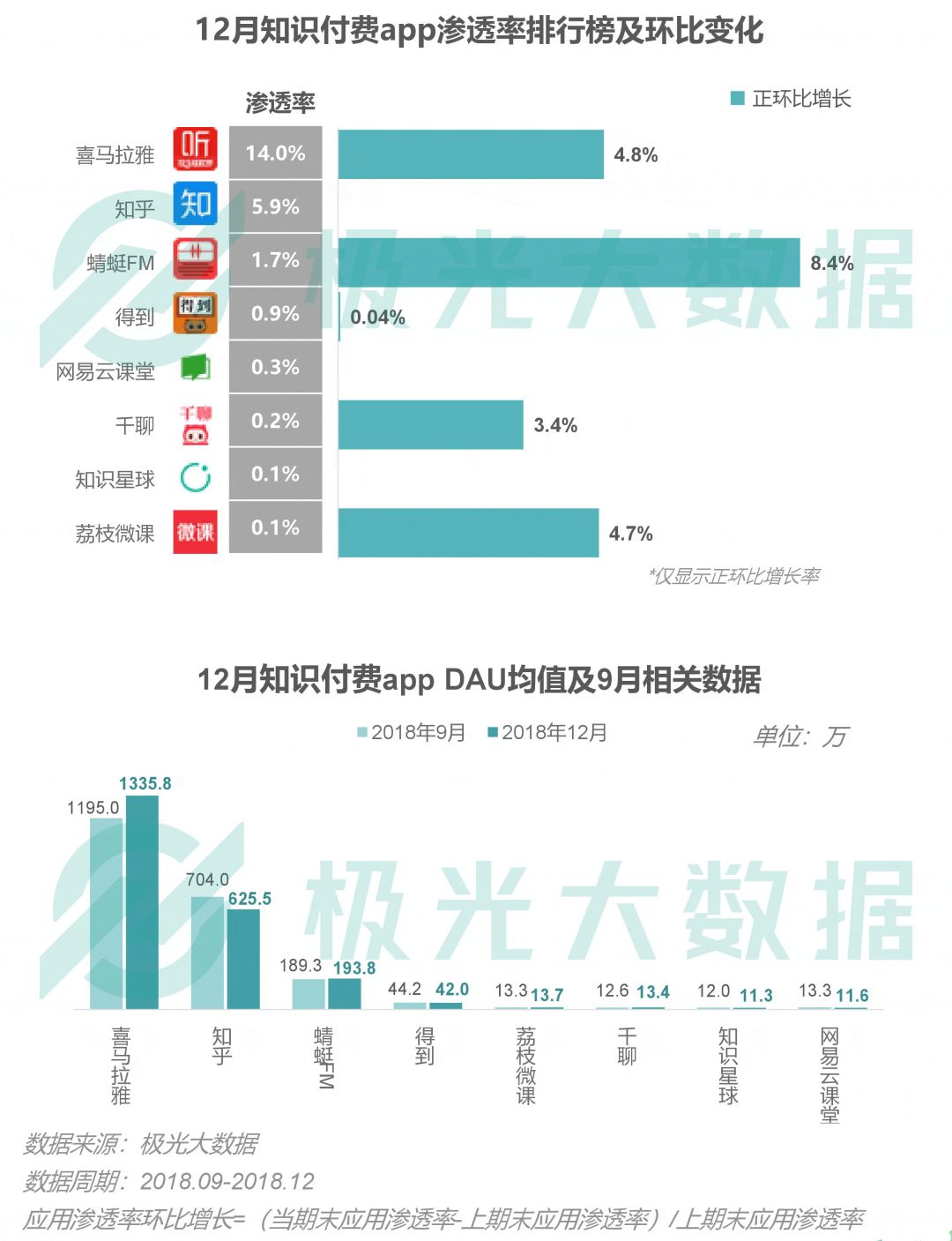 喜马拉雅12月以14%的渗透率居于首位,月均DAU达1335.8万;蜻蜓FM渗透率为1.7%,环比增长8.4%,排名第三;此外得到、千聊和荔枝微课的渗透率也有不同程度的增长