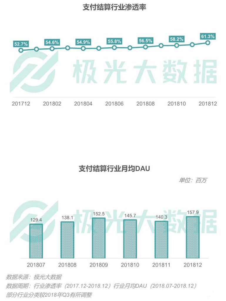 支付结算行业在过去一年里的渗透率呈波动上升趋势,截至2018年12月,支付结算业渗透率达一年内最高峰,为61.3%,同比增长16.3%。随着年末各平台的活动力度增大,12月行业DAU均值上升至157.9万