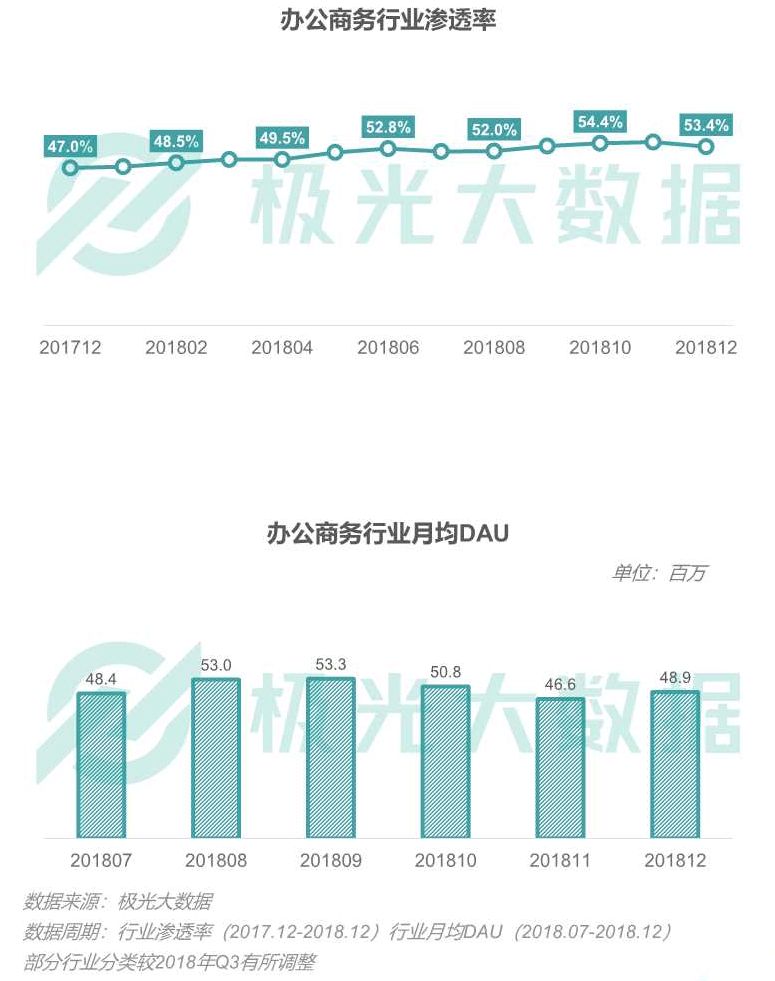 办公商务行业渗透率及月均DAU