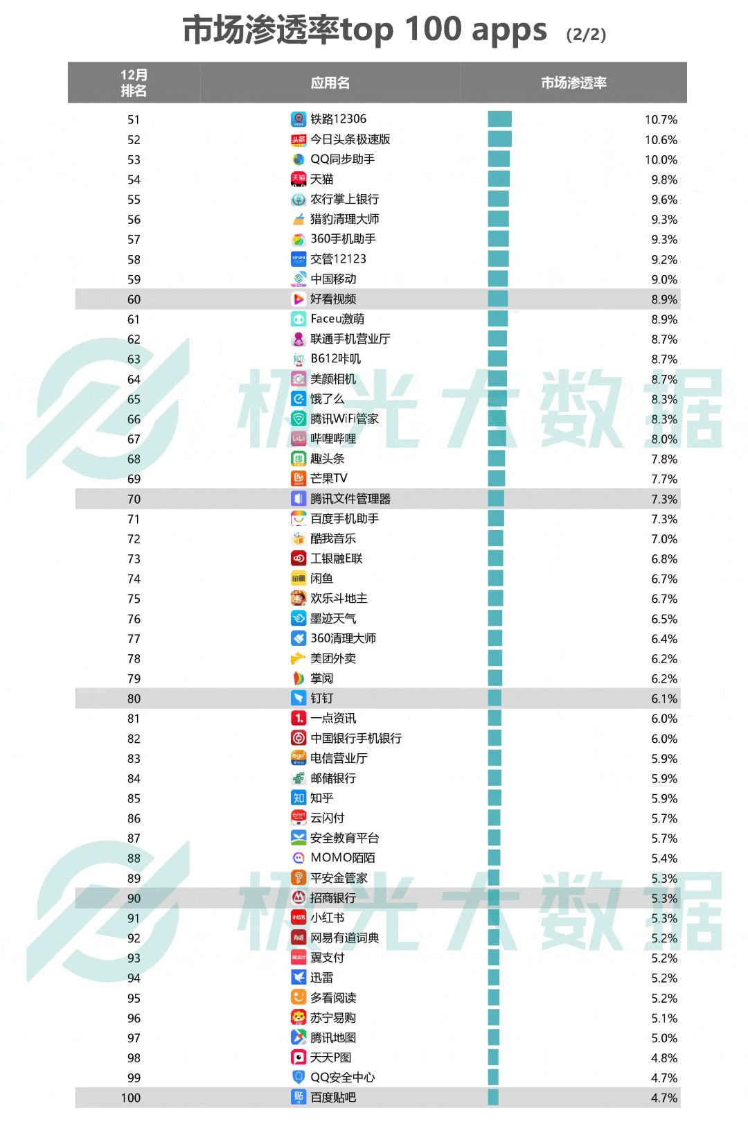 市场渗透率top 100 apps