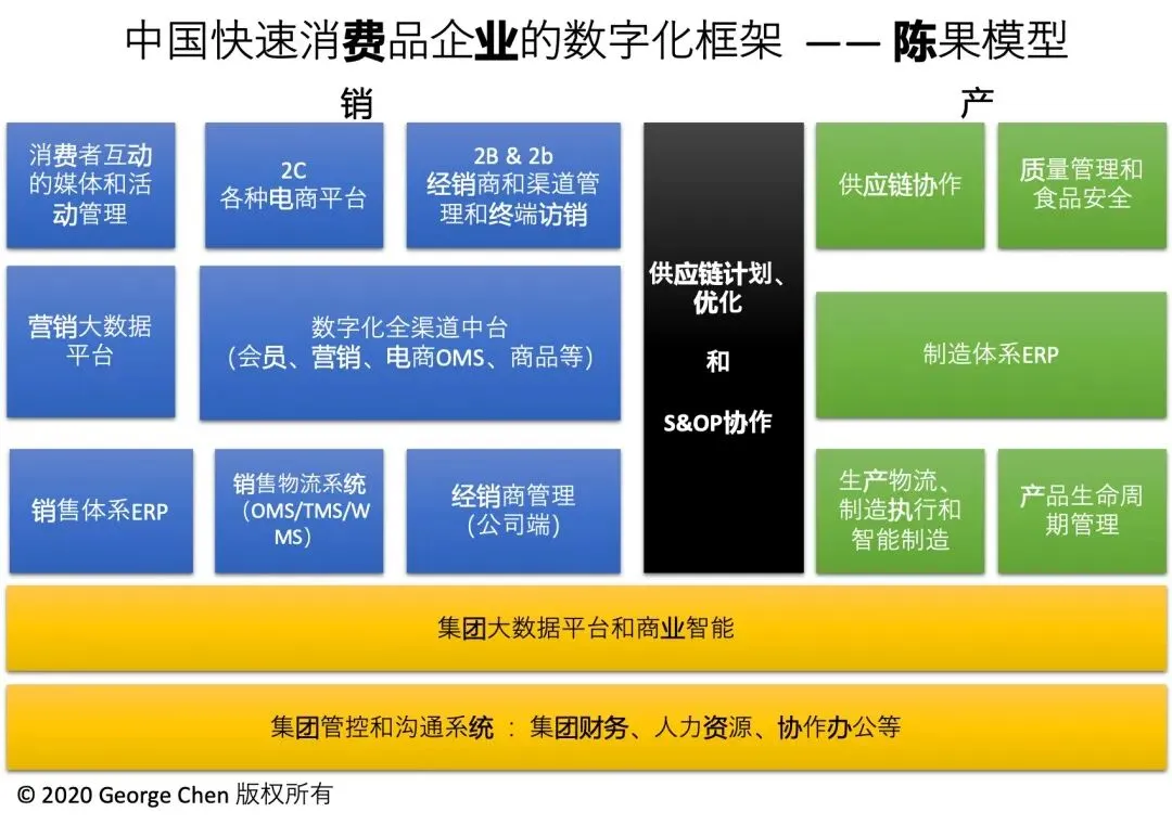 我认为SRM、DMS、TPM 都是 ERP 扩展,或者说 DMS、TPM 本身就是快速消费品行业的在销售管理领域里广义上的 ERP,所以,不论前些年怎么宣传 “从ERP到中台”,绕了一圈,还是要从中台又回到继续夯实 ERP 基础。我在四年前写的消费品企业数字化的架构《中国快速消费品企业的数字化历程和启示》,实际上二十年前是这样,四年前是这样,现在还是这样,不论有没有中台。