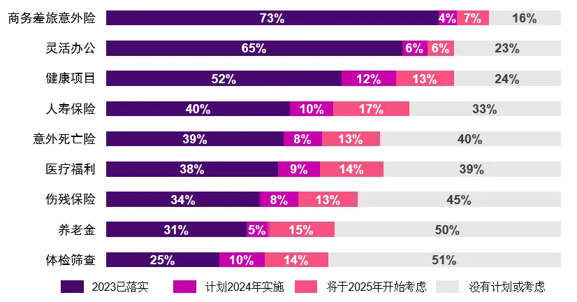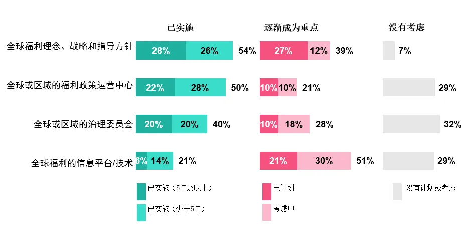 超过50%的受访全球企业已制定全球福利理念、战略和指导方针,设立了全球或区域的福利政策运营中心。更多的雇主开始关注信息安全问题,搭建全球福利信息平台成为未来重点,超过50%的全球企业已计划或考虑该工作。