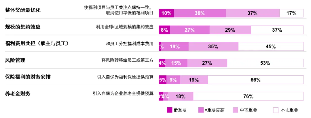 70%的全球雇主认为福利的财务成本是全球福利管理的重中之重。报告中显示,在既定福利支出上获取更高的收益是雇主的优先目标。83%的雇主考虑取消使用率低的福利项目,将钱花在刀刃上,提供员工更加关注的福利。63%的雇主考虑利用全球/区域规模的集约效应节省成本,通过供应商整合,统筹管理来优化财务表现。55%的雇主考虑与员工共担成本,如在美国员工通常支付部分的保费。