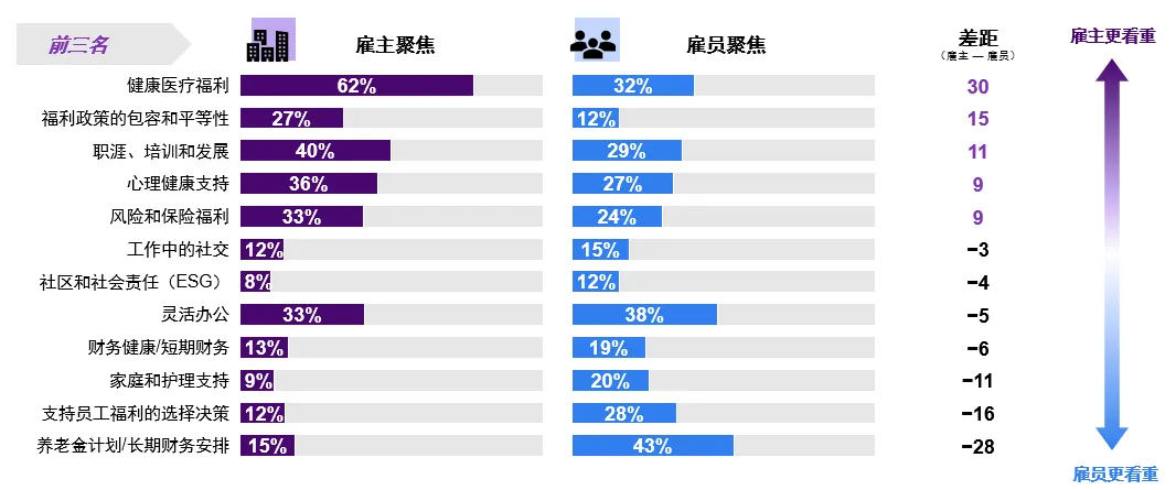雇主希望有效管理成本/风险,并改善员工体验。他们希望通过设计更符合员工需求的福利来解决这个问题。越来越多的企业计划以员工为中心开展福利项目的评估(倾听策略、员工偏好、员工参与和赔付情况)。