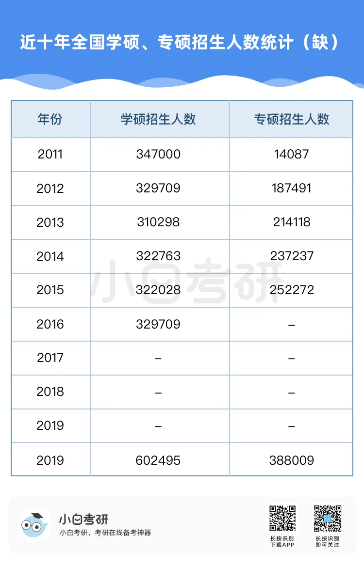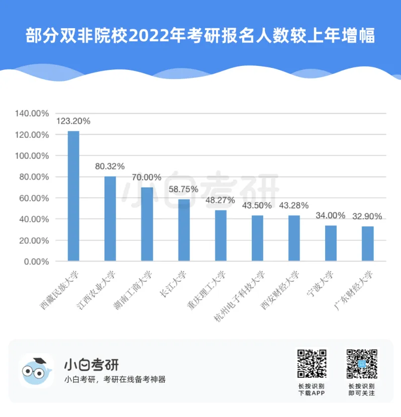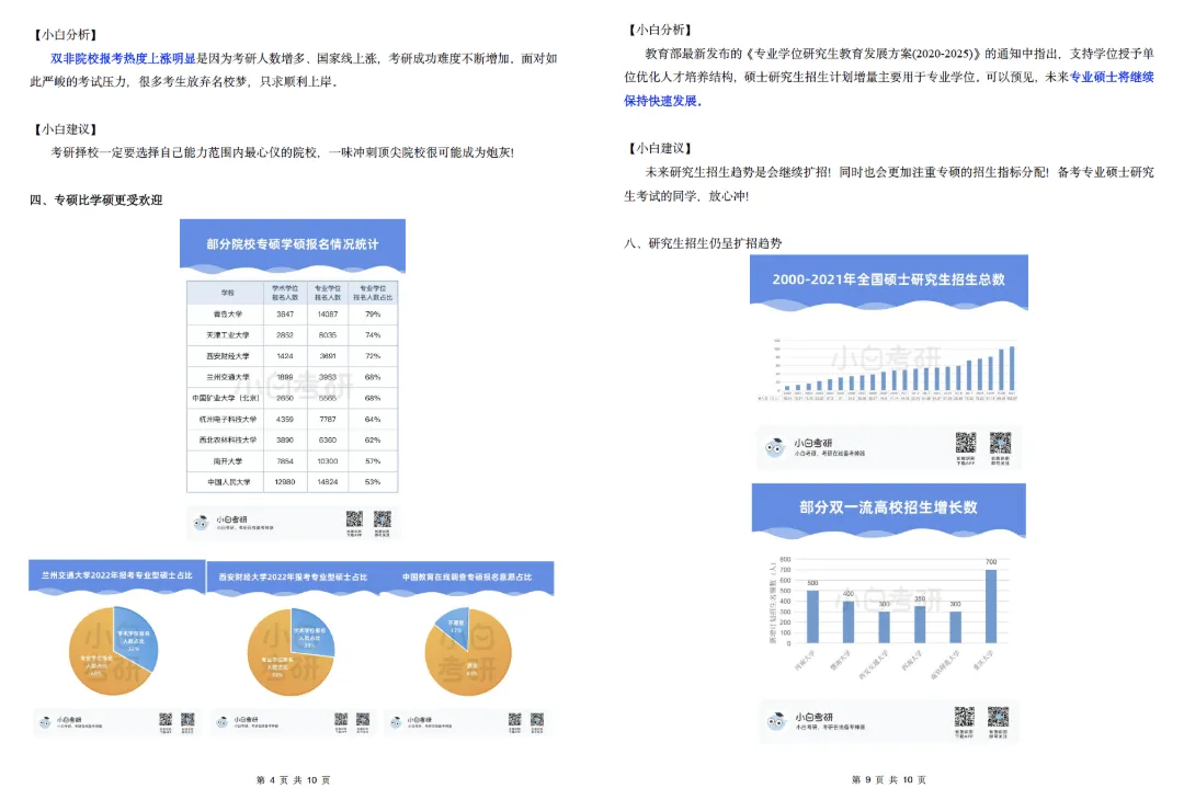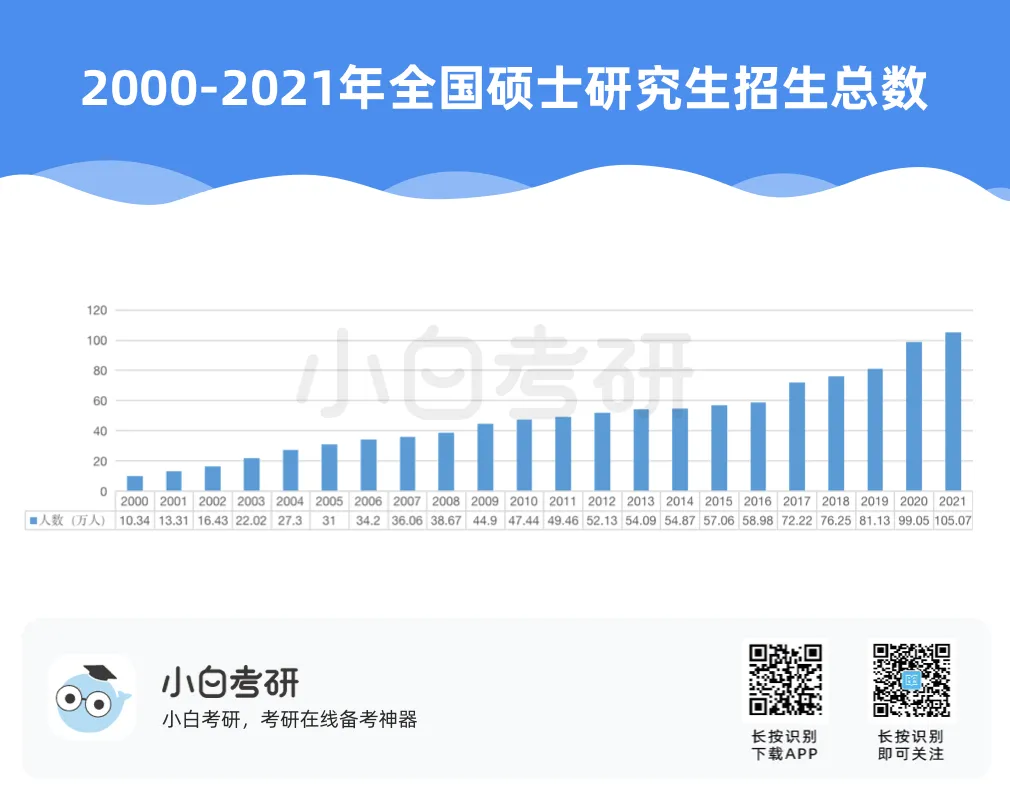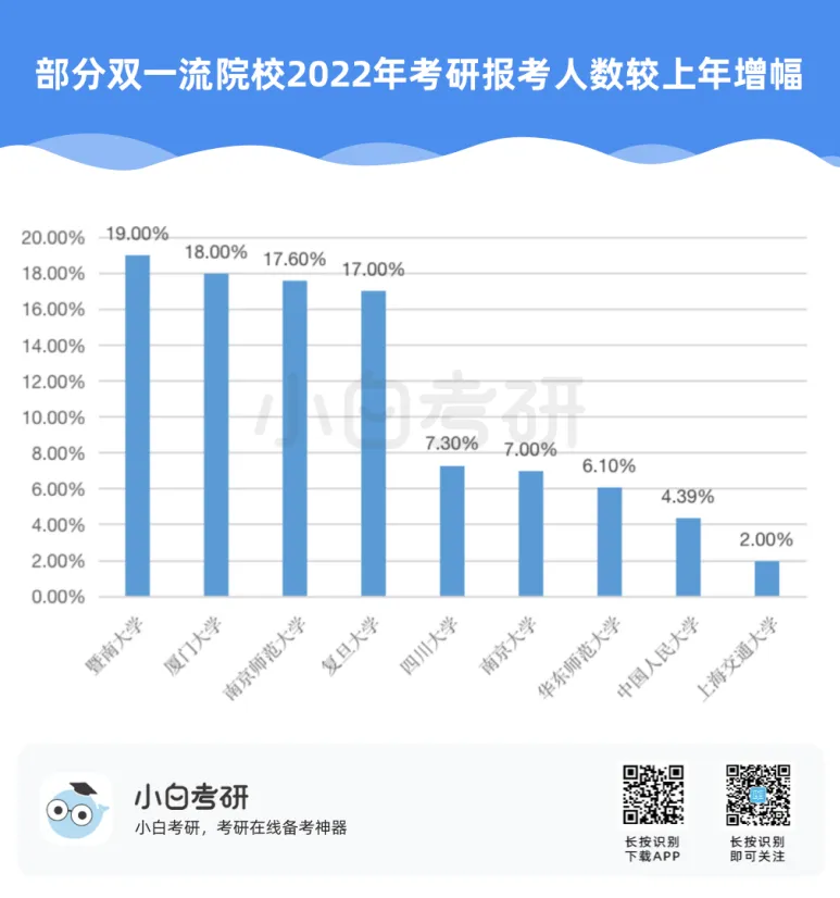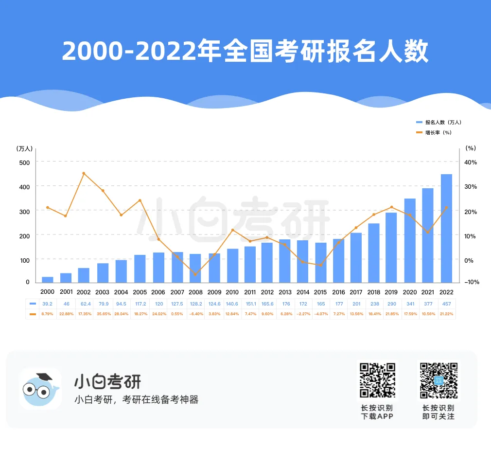 【小白解读】2022年全国硕士研究生报名人数457万,比2021年增长80万,增幅为21%。根据近几年的统计数据,2020年考研报名人数比2019年增加了51万人,2021年比2020年增加了36万人。自2016年起,我国硕士研究生报考人数在高位上保持高增长趋势。【小白建议】考研要趁早!研究生考试竞争只会越来越激烈,建议从进入大学后就提早做好未来规划,就业和读研深造都需要早做准备!【小白解读】各省硕士研究生报名人数均呈现增长趋势。其中增幅较大的省份有:山东、河南、广西等。2022年河南省硕士研究生报名人数为37.9万人,较2021年增加了7.7万人,增幅为25.5%。2022年广西壮族自治区硕士研究生报名人数为7.9万人,较2021年增加了1.5万人,增幅为23.4%。相反,北京、上海却属于增幅较少省市。2022年北京市硕士研究生报名人数为15.4万人,较2021年增加了1.6万人,增幅为11.6%。【小白建议】读研选择学校、专业的同时,城市也是一个重要的考虑因素,直接影响到未来实习、就业发展等。【小白解读】多所高校2022年硕士研究生报名人数相比2021年增长率超过40%。据统计,长江大学、青岛理工大学、重庆理工大学等高校2022年硕士研究生报名人数增长率超过50%。2022年“双一流”院校的硕士研究生报考增速放缓,相比之下,双非院校的报考热度上涨,考研报考人数大幅度增加。西藏民族大学2022年考研报名人数较上一年同比增长123.2%。【小白建议】考研择校一定要选择自己能力范围内最心仪的院校,一味冲刺顶尖院校很可能成为炮灰!【小白解读】报考专业硕士研究生的人数普遍超过学术硕士,这也是研考报考的一个显著特点,尤其是在双非高校。2022年报考西安财经大学硕士研究生的人数为5115人,专业学位报考人数3691人,占比为72%。2022年报考兰州交通大学硕士研究生的人数达5852人,专业学位研究生报考人数3953人,占比达到68%。同时从学生意愿看,更多的同学倾向于报考专业硕士。【小白建议】备考选择时如果觉得学硕名额少、题目难,也可以考虑对应的专硕。但是也千万不要认为专硕就能轻松上岸,专硕招生人数多但报考人数相应也会多,所以无论选择哪一种都必须好好复习准备!【小白解读】从部分高校2022年硕士研究生报考人数来看,应用心理、心理学、新闻与传播、法学等成为网报人数最多的专业,可以看出人文社科类专业竞争更为激烈。【小白建议】考研打算跨专业报考热门人文社科专业的同学,可一定要尽早开始复习,毕竟这些专业可能存在400+还要调剂的惨状!【小白解读】根据报告中对考研动机的调查分析,就业压力成为考生选择考研的最主要因素。近六成的考生因为就业压力大,想增强就业竞争力而选择考研。我国具有研究生学历的就业者比例稳步上升。2007年我国就业人群中研究生学历人数占比为0.2%,之后占比不断上升。到2019年,我国就业人群中研究生学历占比达到1.1%。也就是说每100名就业者中就有1名拥有研究生学历。【小白建议】考研变成“千军万马过独木桥”,想要一战上岸,必须踏实准备,认真备考。考研人一定要在正确的选择下做最大的努力,既然选择了考研便只能不舍昼夜,风雨兼程!【小白解读】在相关政策的推动下,硕士研究生招生总人数中,专硕招生人数增长明显。从2011年的15.8万增长到2020年的60.2万,专硕招生人数增长近4倍。2017年起,专硕招生人数首次超过学硕,并持续高速增长。近十年硕士研究生招生中,专硕占比逐年提升,2020年占比超过60%。【小白建议】未来研究生招生趋势是会继续扩招!同时也会更加注重专硕的招生指标分配!备考专业硕士研究生考试的同学,放心冲!【小白解读】近年来,我国研究生招生规模持续扩大。2011年研究生招生总人数56万,到2020年达到110.6万人,2021年则达到了约120万。十年间,研究生招生总人数增长近一倍。著名高校继续扩大硕士研究生招生规模。与2021年全国硕士研究生招生计划相比,2022年“双一流”高校招生计划均明显增长。【小白建议】整体扩招的趋势中,考研人还应具体关注目标院校招生情况,对于历年来有扩招趋势的院校,可以优先选择,这类院校同等情况下,上岸几率更大。那些每年比计划数再多招考生的院校更是考研红榜院校!