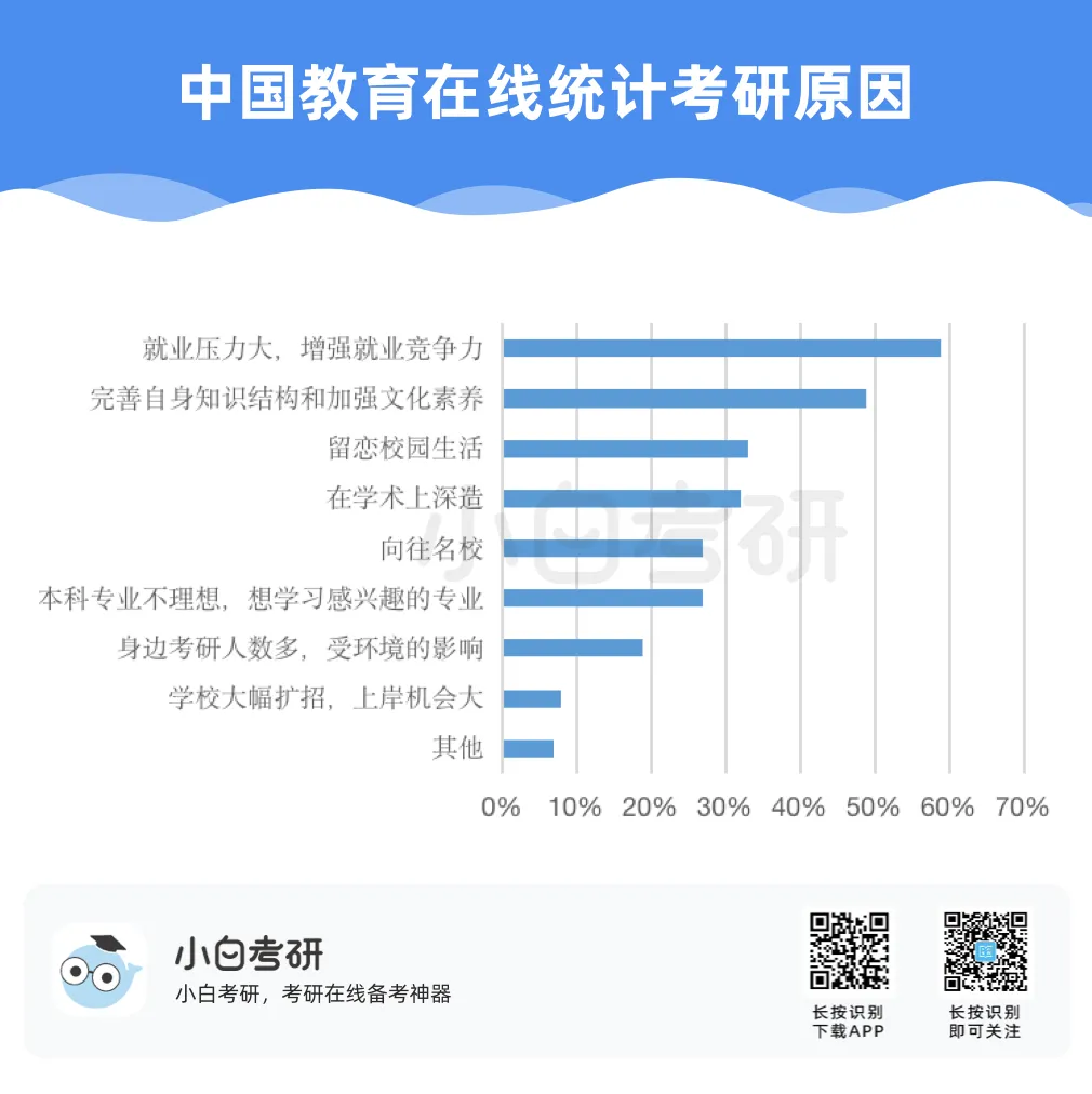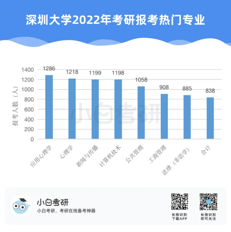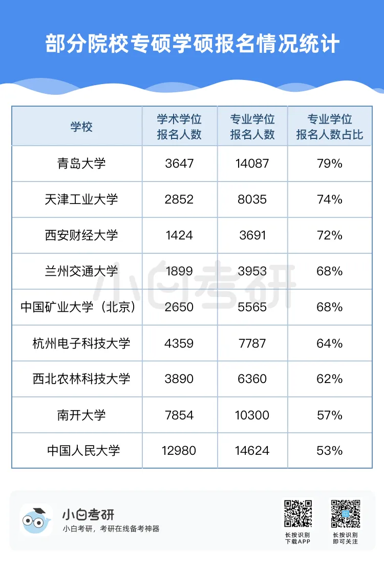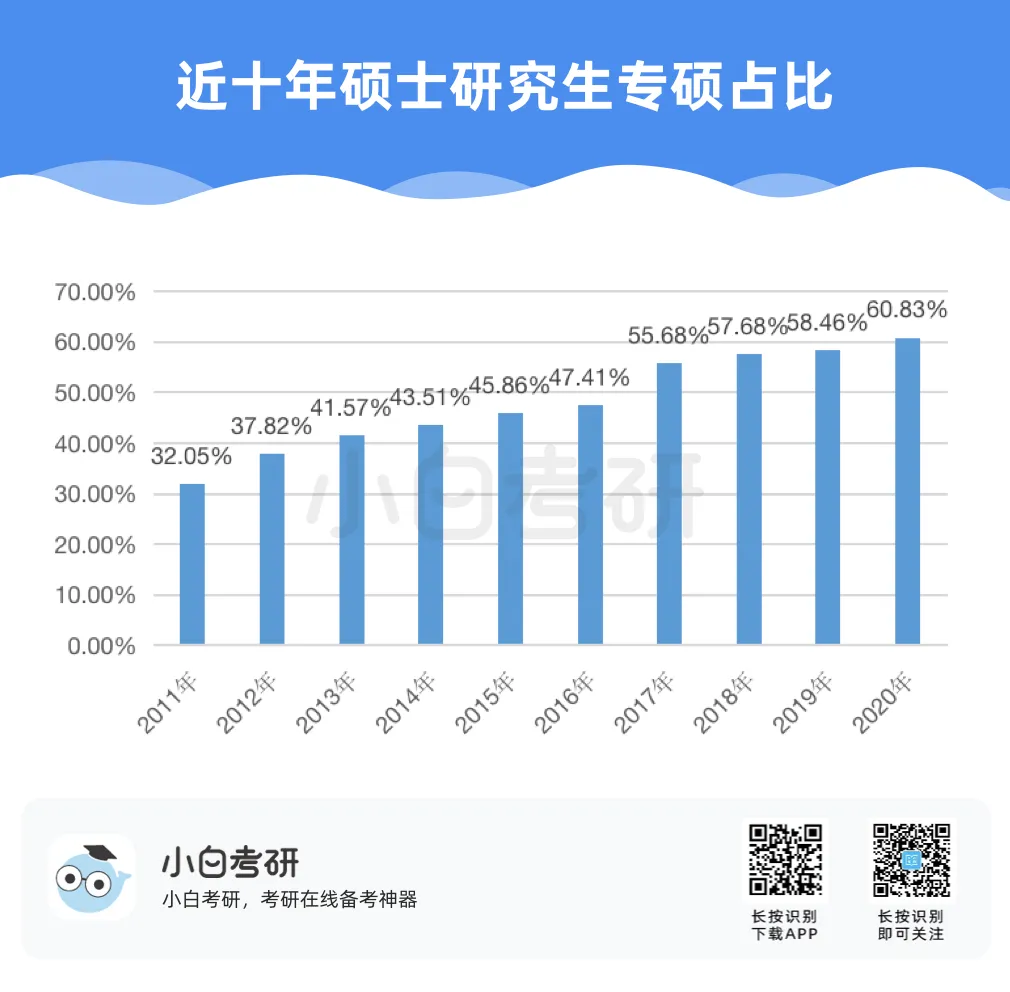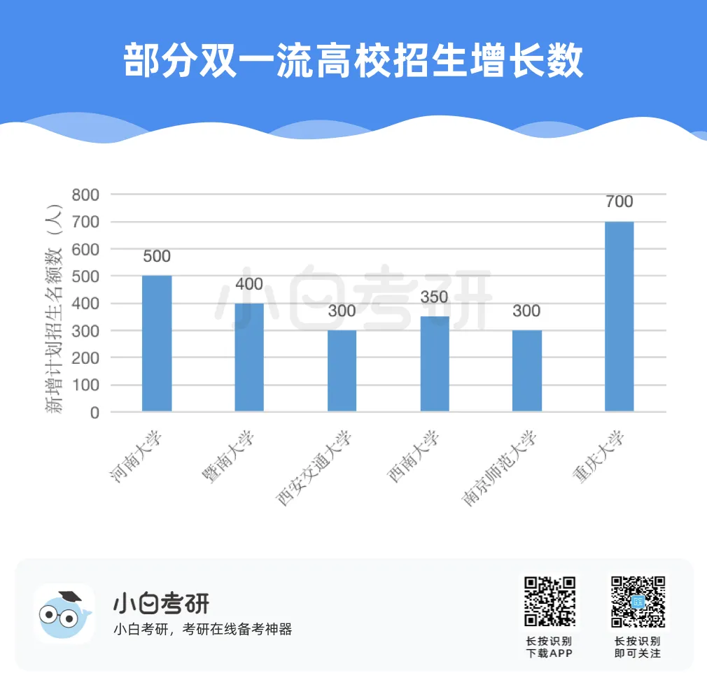 【小白解读】2022年全国硕士研究生报名人数457万,比2021年增长80万,增幅为21%。根据近几年的统计数据,2020年考研报名人数比2019年增加了51万人,2021年比2020年增加了36万人。自2016年起,我国硕士研究生报考人数在高位上保持高增长趋势。【小白建议】考研要趁早!研究生考试竞争只会越来越激烈,建议从进入大学后就提早做好未来规划,就业和读研深造都需要早做准备!【小白解读】各省硕士研究生报名人数均呈现增长趋势。其中增幅较大的省份有:山东、河南、广西等。2022年河南省硕士研究生报名人数为37.9万人,较2021年增加了7.7万人,增幅为25.5%。2022年广西壮族自治区硕士研究生报名人数为7.9万人,较2021年增加了1.5万人,增幅为23.4%。相反,北京、上海却属于增幅较少省市。2022年北京市硕士研究生报名人数为15.4万人,较2021年增加了1.6万人,增幅为11.6%。【小白建议】读研选择学校、专业的同时,城市也是一个重要的考虑因素,直接影响到未来实习、就业发展等。【小白解读】多所高校2022年硕士研究生报名人数相比2021年增长率超过40%。据统计,长江大学、青岛理工大学、重庆理工大学等高校2022年硕士研究生报名人数增长率超过50%。2022年“双一流”院校的硕士研究生报考增速放缓,相比之下,双非院校的报考热度上涨,考研报考人数大幅度增加。西藏民族大学2022年考研报名人数较上一年同比增长123.2%。【小白建议】考研择校一定要选择自己能力范围内最心仪的院校,一味冲刺顶尖院校很可能成为炮灰!【小白解读】报考专业硕士研究生的人数普遍超过学术硕士,这也是研考报考的一个显著特点,尤其是在双非高校。2022年报考西安财经大学硕士研究生的人数为5115人,专业学位报考人数3691人,占比为72%。2022年报考兰州交通大学硕士研究生的人数达5852人,专业学位研究生报考人数3953人,占比达到68%。同时从学生意愿看,更多的同学倾向于报考专业硕士。【小白建议】备考选择时如果觉得学硕名额少、题目难,也可以考虑对应的专硕。但是也千万不要认为专硕就能轻松上岸,专硕招生人数多但报考人数相应也会多,所以无论选择哪一种都必须好好复习准备!【小白解读】从部分高校2022年硕士研究生报考人数来看,应用心理、心理学、新闻与传播、法学等成为网报人数最多的专业,可以看出人文社科类专业竞争更为激烈。【小白建议】考研打算跨专业报考热门人文社科专业的同学,可一定要尽早开始复习,毕竟这些专业可能存在400+还要调剂的惨状!【小白解读】根据报告中对考研动机的调查分析,就业压力成为考生选择考研的最主要因素。近六成的考生因为就业压力大,想增强就业竞争力而选择考研。我国具有研究生学历的就业者比例稳步上升。2007年我国就业人群中研究生学历人数占比为0.2%,之后占比不断上升。到2019年,我国就业人群中研究生学历占比达到1.1%。也就是说每100名就业者中就有1名拥有研究生学历。【小白建议】考研变成“千军万马过独木桥”,想要一战上岸,必须踏实准备,认真备考。考研人一定要在正确的选择下做最大的努力,既然选择了考研便只能不舍昼夜,风雨兼程!【小白解读】在相关政策的推动下,硕士研究生招生总人数中,专硕招生人数增长明显。从2011年的15.8万增长到2020年的60.2万,专硕招生人数增长近4倍。2017年起,专硕招生人数首次超过学硕,并持续高速增长。近十年硕士研究生招生中,专硕占比逐年提升,2020年占比超过60%。【小白建议】未来研究生招生趋势是会继续扩招!同时也会更加注重专硕的招生指标分配!备考专业硕士研究生考试的同学,放心冲!【小白解读】近年来,我国研究生招生规模持续扩大。2011年研究生招生总人数56万,到2020年达到110.6万人,2021年则达到了约120万。十年间,研究生招生总人数增长近一倍。著名高校继续扩大硕士研究生招生规模。与2021年全国硕士研究生招生计划相比,2022年“双一流”高校招生计划均明显增长。【小白建议】整体扩招的趋势中,考研人还应具体关注目标院校招生情况,对于历年来有扩招趋势的院校,可以优先选择,这类院校同等情况下,上岸几率更大。那些每年比计划数再多招考生的院校更是考研红榜院校!