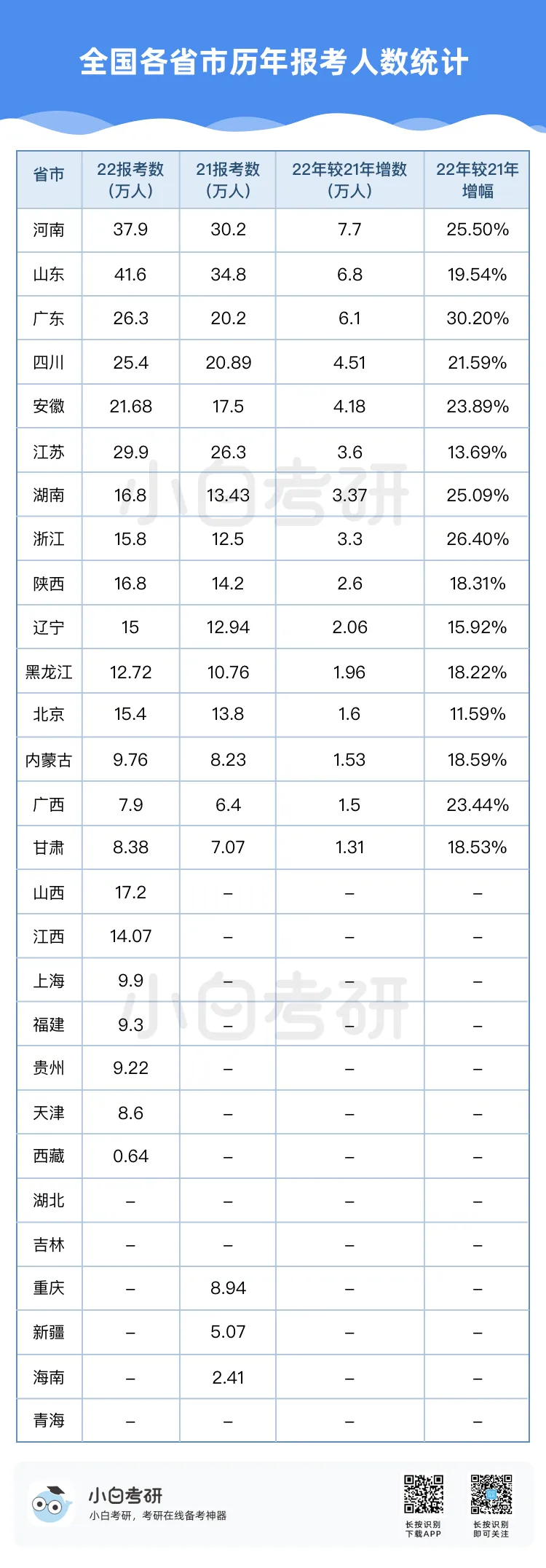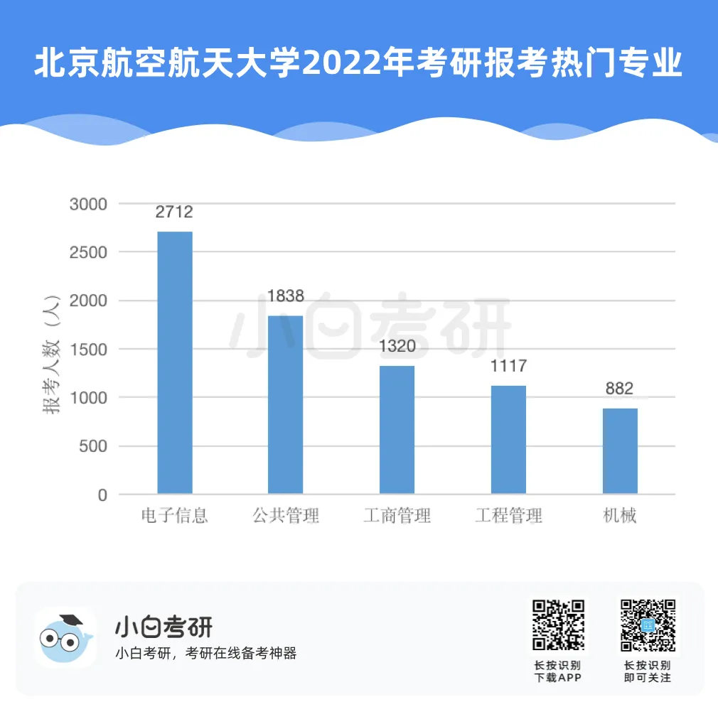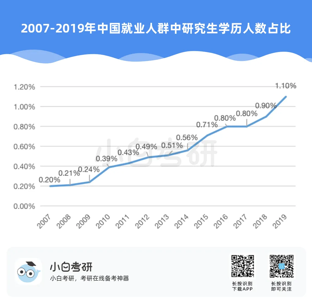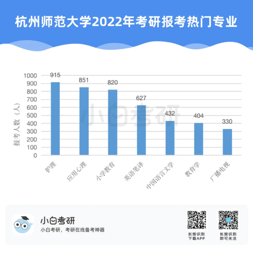 【小白解读】2022年全国硕士研究生报名人数457万,比2021年增长80万,增幅为21%。根据近几年的统计数据,2020年考研报名人数比2019年增加了51万人,2021年比2020年增加了36万人。自2016年起,我国硕士研究生报考人数在高位上保持高增长趋势。【小白建议】考研要趁早!研究生考试竞争只会越来越激烈,建议从进入大学后就提早做好未来规划,就业和读研深造都需要早做准备!【小白解读】各省硕士研究生报名人数均呈现增长趋势。其中增幅较大的省份有:山东、河南、广西等。2022年河南省硕士研究生报名人数为37.9万人,较2021年增加了7.7万人,增幅为25.5%。2022年广西壮族自治区硕士研究生报名人数为7.9万人,较2021年增加了1.5万人,增幅为23.4%。相反,北京、上海却属于增幅较少省市。2022年北京市硕士研究生报名人数为15.4万人,较2021年增加了1.6万人,增幅为11.6%。【小白建议】读研选择学校、专业的同时,城市也是一个重要的考虑因素,直接影响到未来实习、就业发展等。【小白解读】多所高校2022年硕士研究生报名人数相比2021年增长率超过40%。据统计,长江大学、青岛理工大学、重庆理工大学等高校2022年硕士研究生报名人数增长率超过50%。2022年“双一流”院校的硕士研究生报考增速放缓,相比之下,双非院校的报考热度上涨,考研报考人数大幅度增加。西藏民族大学2022年考研报名人数较上一年同比增长123.2%。【小白建议】考研择校一定要选择自己能力范围内最心仪的院校,一味冲刺顶尖院校很可能成为炮灰!【小白解读】报考专业硕士研究生的人数普遍超过学术硕士,这也是研考报考的一个显著特点,尤其是在双非高校。2022年报考西安财经大学硕士研究生的人数为5115人,专业学位报考人数3691人,占比为72%。2022年报考兰州交通大学硕士研究生的人数达5852人,专业学位研究生报考人数3953人,占比达到68%。同时从学生意愿看,更多的同学倾向于报考专业硕士。【小白建议】备考选择时如果觉得学硕名额少、题目难,也可以考虑对应的专硕。但是也千万不要认为专硕就能轻松上岸,专硕招生人数多但报考人数相应也会多,所以无论选择哪一种都必须好好复习准备!【小白解读】从部分高校2022年硕士研究生报考人数来看,应用心理、心理学、新闻与传播、法学等成为网报人数最多的专业,可以看出人文社科类专业竞争更为激烈。【小白建议】考研打算跨专业报考热门人文社科专业的同学,可一定要尽早开始复习,毕竟这些专业可能存在400+还要调剂的惨状!【小白解读】根据报告中对考研动机的调查分析,就业压力成为考生选择考研的最主要因素。近六成的考生因为就业压力大,想增强就业竞争力而选择考研。我国具有研究生学历的就业者比例稳步上升。2007年我国就业人群中研究生学历人数占比为0.2%,之后占比不断上升。到2019年,我国就业人群中研究生学历占比达到1.1%。也就是说每100名就业者中就有1名拥有研究生学历。【小白建议】考研变成“千军万马过独木桥”,想要一战上岸,必须踏实准备,认真备考。考研人一定要在正确的选择下做最大的努力,既然选择了考研便只能不舍昼夜,风雨兼程!【小白解读】在相关政策的推动下,硕士研究生招生总人数中,专硕招生人数增长明显。从2011年的15.8万增长到2020年的60.2万,专硕招生人数增长近4倍。2017年起,专硕招生人数首次超过学硕,并持续高速增长。近十年硕士研究生招生中,专硕占比逐年提升,2020年占比超过60%。【小白建议】未来研究生招生趋势是会继续扩招!同时也会更加注重专硕的招生指标分配!备考专业硕士研究生考试的同学,放心冲!【小白解读】近年来,我国研究生招生规模持续扩大。2011年研究生招生总人数56万,到2020年达到110.6万人,2021年则达到了约120万。十年间,研究生招生总人数增长近一倍。著名高校继续扩大硕士研究生招生规模。与2021年全国硕士研究生招生计划相比,2022年“双一流”高校招生计划均明显增长。【小白建议】整体扩招的趋势中,考研人还应具体关注目标院校招生情况,对于历年来有扩招趋势的院校,可以优先选择,这类院校同等情况下,上岸几率更大。那些每年比计划数再多招考生的院校更是考研红榜院校!