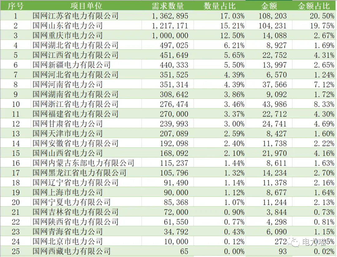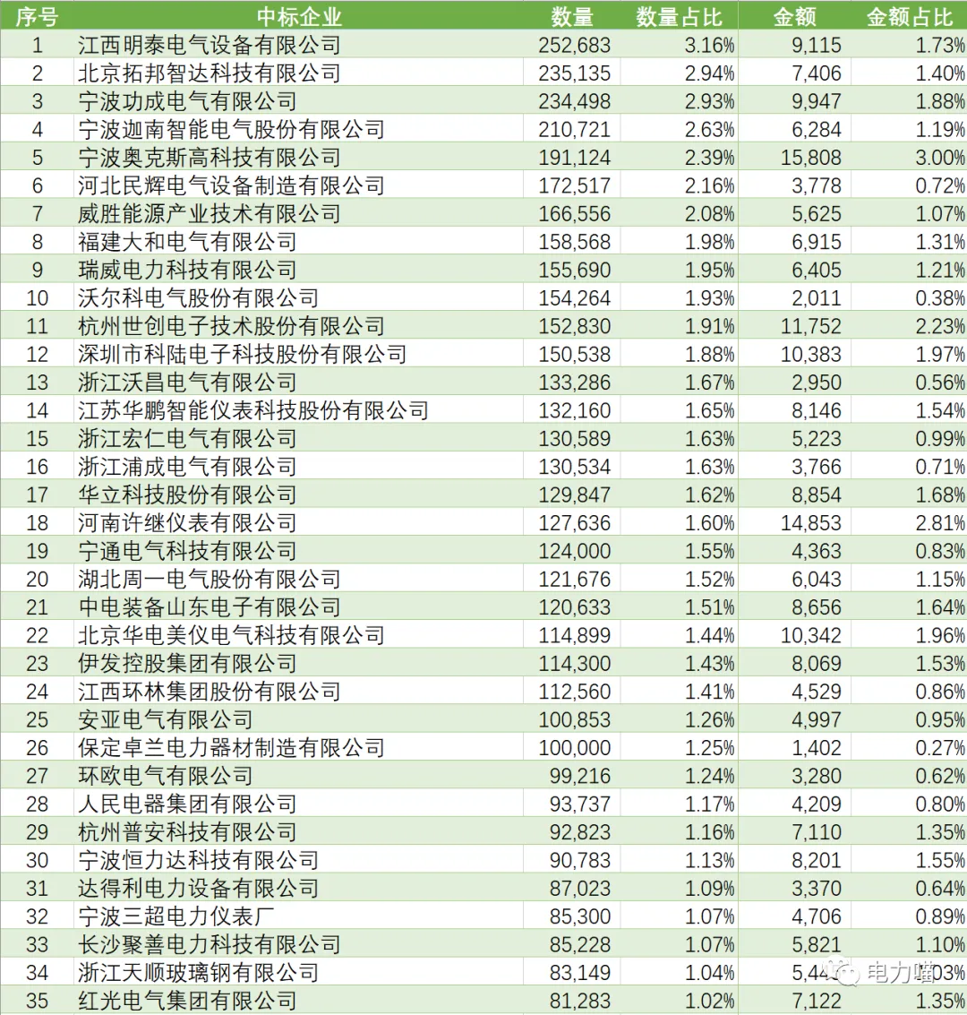中标企业中,江西明泰电气设备有限公司中标数量最多,占比3.16%;中标数量超过100,000只的企业共有26家,占中标企业总数量的13%;数量占比超过1%的企业共有35家,占中标企业总数量的18%;中标数量的中位数是41,029只,超过中位数的企业共有65家,占中标企业总数量的33%。