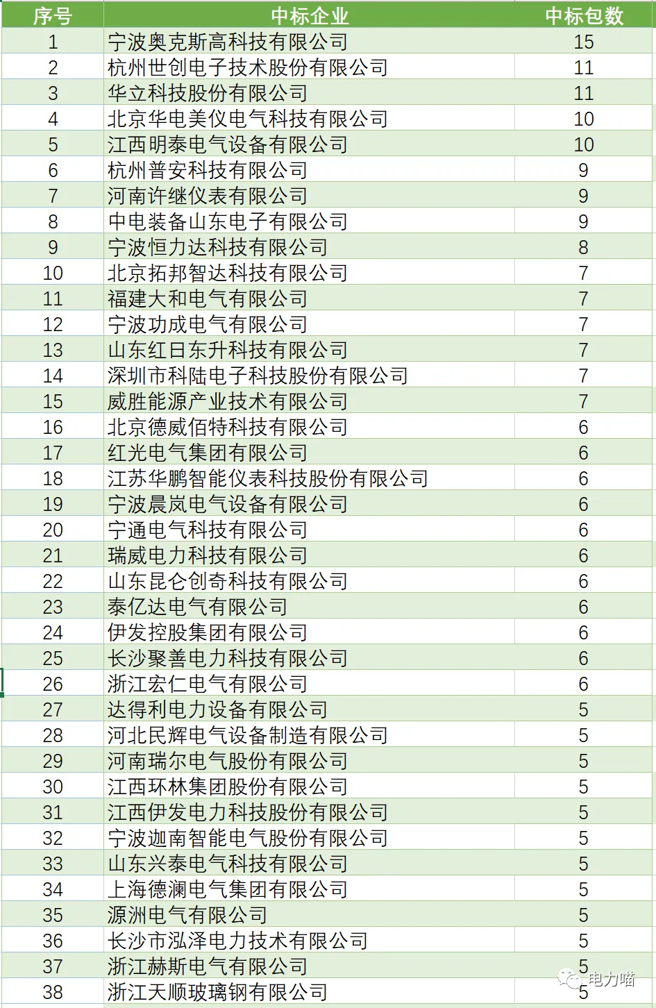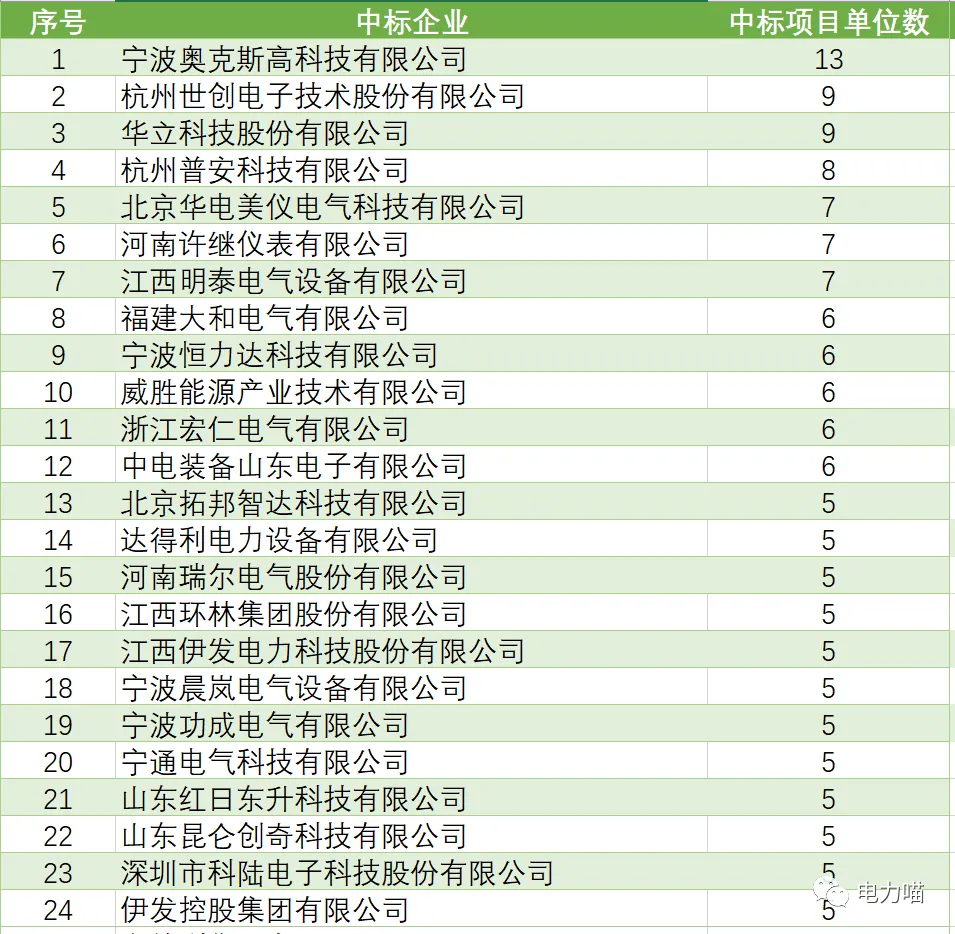 中标项目单位数方面,共有6家企业在两个或以上电力公司中标,占中标企业总数的33%。宁波奥克斯高科技有限公司中标项目单位数最多,有4个。