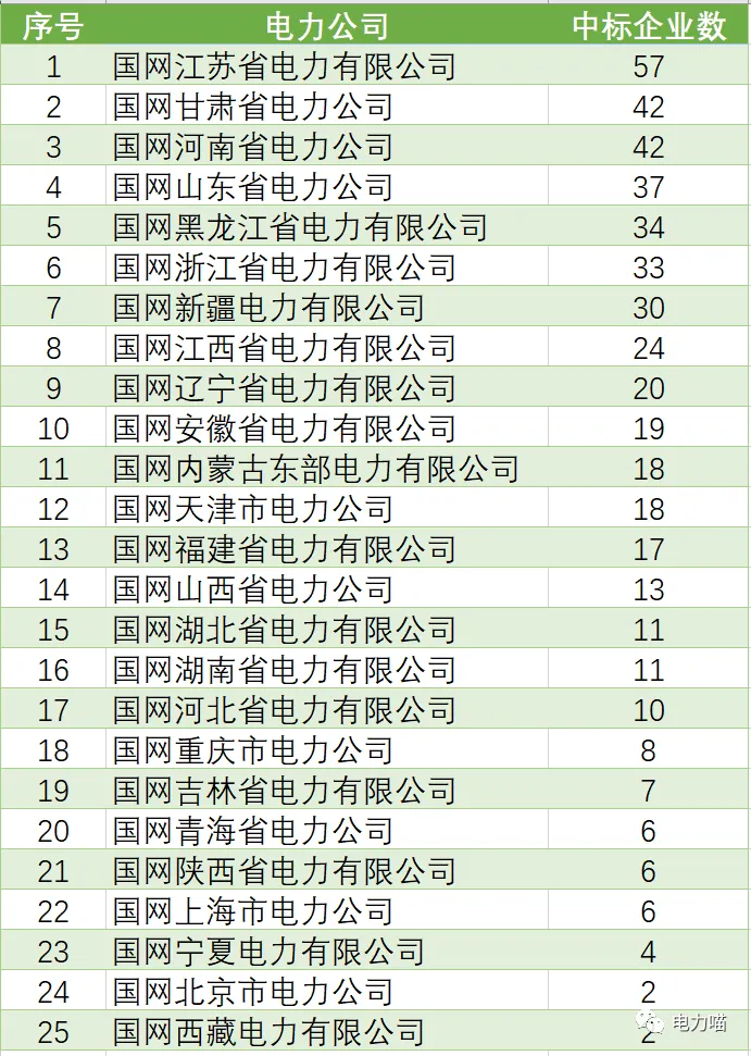 各电力公司中标企业数量方面,在国网江苏省电力有限公司共有57家企业中标,超过10家企业中标的电力公司共有17个。