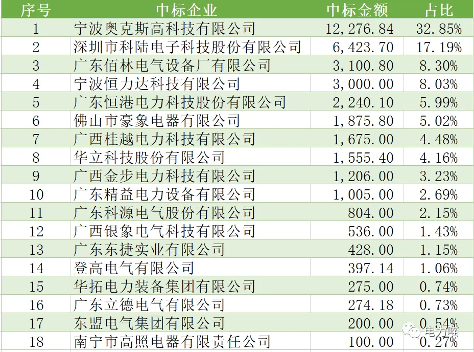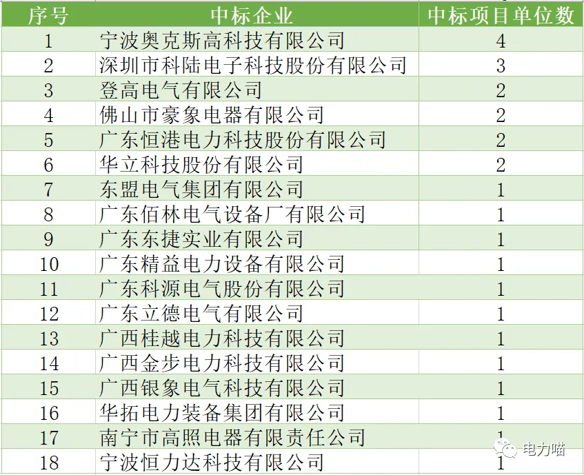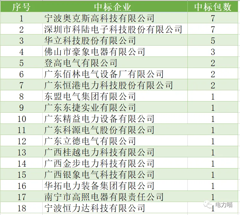 2021年度,南网范围共有18家企业中标电能计量箱产品。