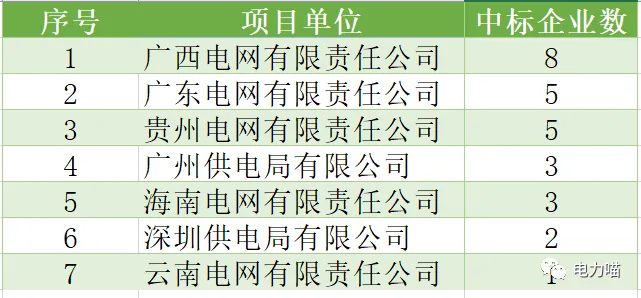 各电力公司中标企业数量方面,在广西电网共有8家企业中标。