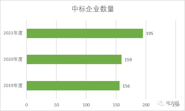 从这三年中标企业数量来看,市场竞争十分激烈,在2021年度,中标企业数量仍旧在大幅增加。