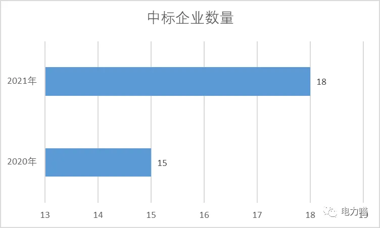 从这两年中标企业数量来看,南网市场竞争激烈程度总体尚可,在2021年度,中标企业数量略有增加。