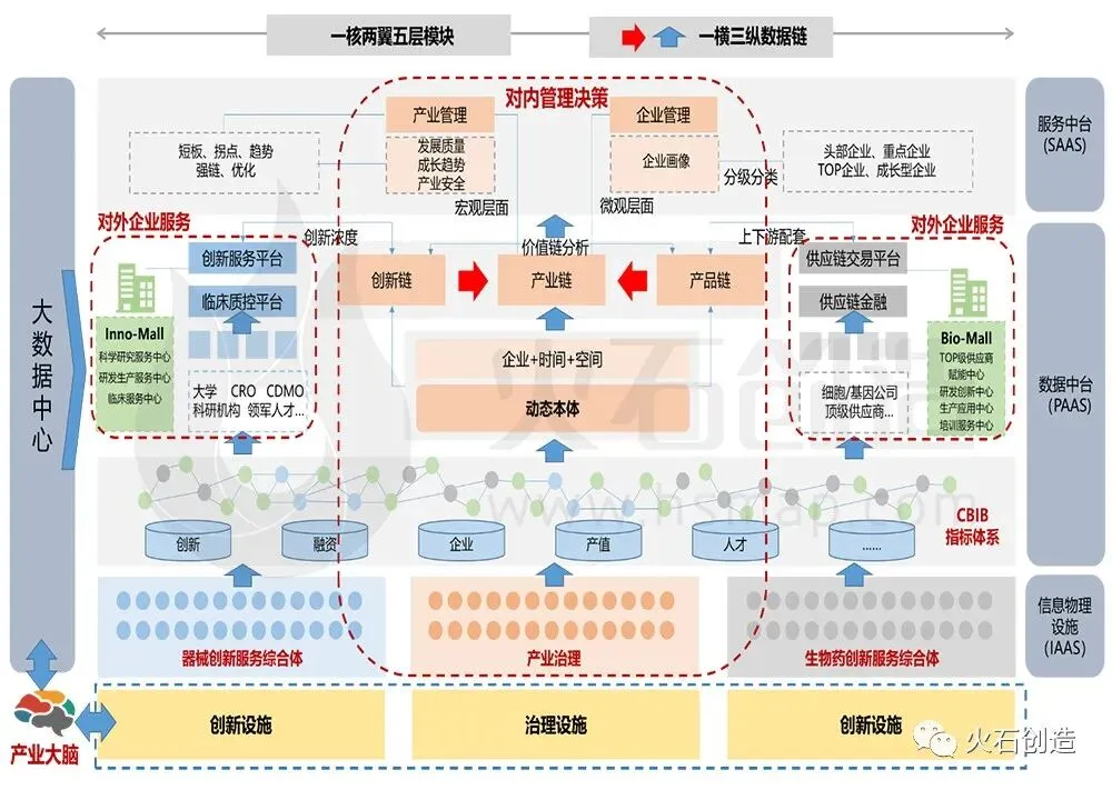 其中,在生物医药领域,将产业数字化治理设施作为“一核”,连接产业创新设施的器械创新综合服务体和生物药创新综合服务体作为“两翼”,构建五层次的智能化数据模块,相应形成“一核两翼”模块的三个纵向数据链路,以及贯穿三个模块的创新链-产品链-供应链的横向数据链路。