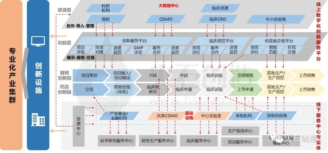 在N个专业化园区,根据行业属性,建设N个产业创新设施。以生物医药专业园区为例,建设器械创新综合服务体和生物药创新综合服务体,线下构建科学研究服务中心、研发生产服务中心、临床服务中心、TOP级供应商赋能中心、生产应用中心、培训服务中心等,线上建设创新服务、供应链交易、临床质控三大数字化平台,形成从实验室、中试、临床、生产到营销的全环节支持。