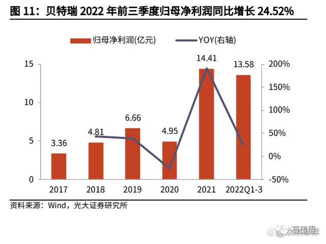 贝特瑞成立于 2000 年,是一家专注于锂电池材料开发与制造的国家级高新技术 企业。公司以技术创新为引领,以技术领先、产品及产业链布局完善、国际与国内主流客户并重为特色,在行业中占据突出地位。公司核心产品主要包括锂离子 电池负极材料、正极材料及石墨烯材料。2020 年,贝特瑞的产量在全国负极材 料市场占比 22%,位列行业第一。2015 年贝特瑞成功上市新三板,2021 年顺 利平移实现北交所上市。2021 年公司业绩快速增长。随着新能源汽车需求增长带动锂电子电池及材料行业的快速发展,公司产品产销潜力迅速释放,2021年公司实现营业总收入104.91 亿元,同比增长 135.67%,归母净利润为 14.41 亿元,同比增长 191.39%。2022 年前三季度增速保持,公司营业总收入为 175.68 亿元,同比增长 156.43%,归 母净利率为 13.58 亿元,同比增长 24.52%。