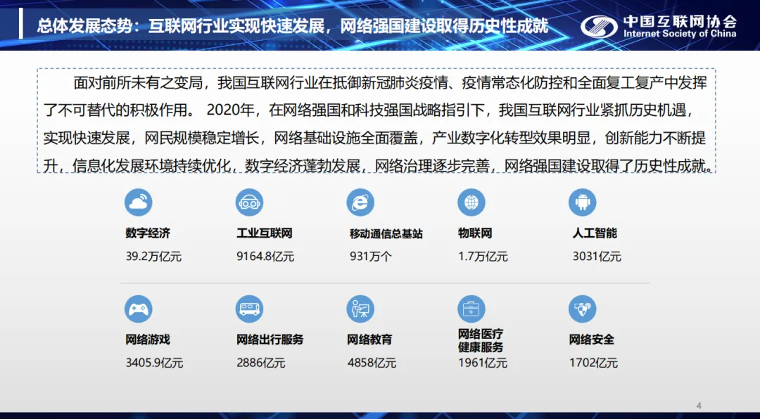《中国互联网发展报告(2021)》显示,2020年,我国移动通信总基站已达931万个、数字经济市场规模已达39.2万亿元、工业互联网市场规模达9164.8亿元、物联网市场规模达1.7万亿元、人工智能市场规模达3031亿元、网络安全市场规模达1702亿元、网络教育市场规模达4858亿元。