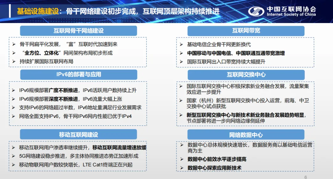 CDN市场合作竞争格局日趋显现,移动互联网用户的渗透率继续提升,移动互联网流量的增量趋于放缓。总体来看,网络基础设施建设带动了我国信息通信技术快速发展,有力支撑了传统制造业和国民经济多个产业数字化转型升级,成为数字经济发展的重要基石。