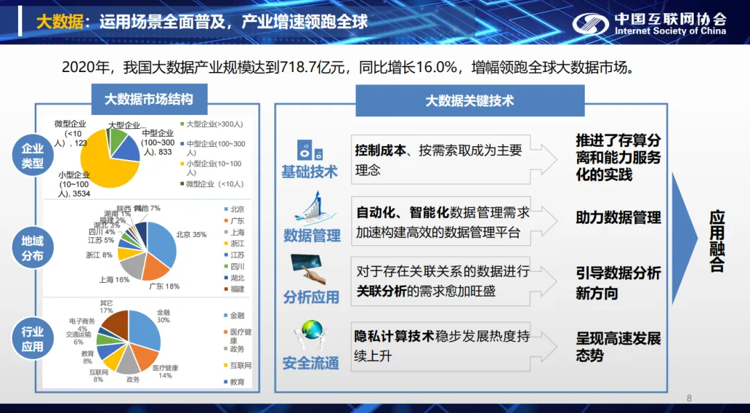 ● 大数据领域:2020年我国大数据产业规模达到了718.7亿元,增幅领跑全球数据市场。我国大数据企业主要分布在北京、广东、上海、浙江等经济发达省份,受政策环境影响、人才创新、资金资源等因素的影响,北京大数据产业实力雄厚,大数据企业数量占全国总数量的35%。大数据在金融、医疗健康、政务几个大领域成绩突出,在关键技术创新方面控制成本,利用AI技术来提升数据管理的能力,加强联动关联分析技术,来提升隐私计算的水平。
