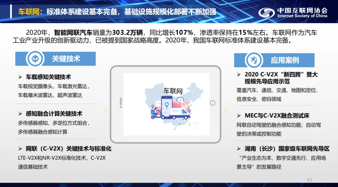 ● 在车联网领域:2020年智能网联汽车的销量超过了303万辆,同比增长了107%。车联网为汽车工业产业的升级提供了驱动力,已被提到国家战略的高度,我国车联网标准体系建设已经基本完成。随着车联网技术及应用的日益普及,智能化交通已成为必然的发展趋势。我们认为车联网先导应用应该是在自动出车、自动停车、高速路自动驾驶、特定区域的自动驾驶等领域。