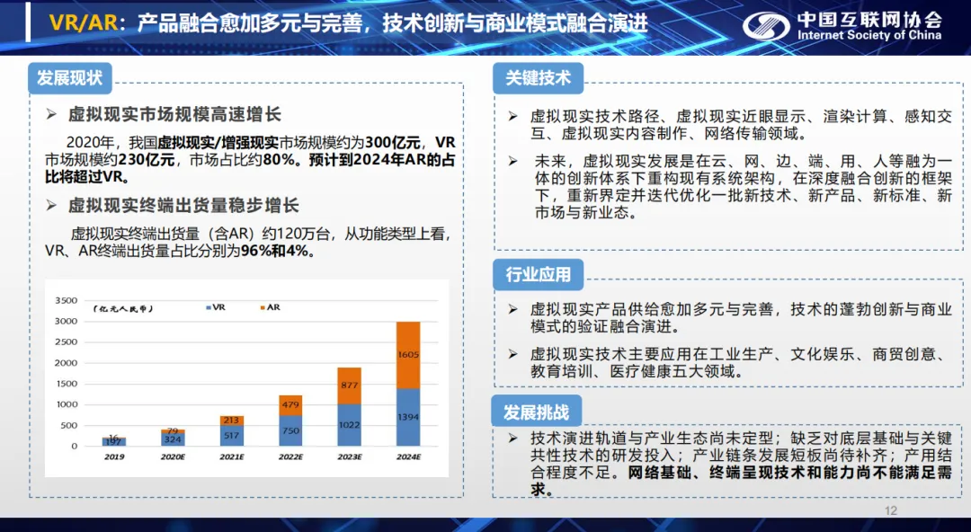 ● 在VR/AR领域:2020年AR市场规模约为300亿,VR市场规模约230亿元,市场占比约80%,预计到2024年AR的占比将超过VR。虚拟现实技术也面临着技术演进轨道与产业生态尚未定型,缺乏对底层基础与关键性技术的研发投入,产业链发展短板尚待需要补足,产业结合度不足是发展中的新挑战。