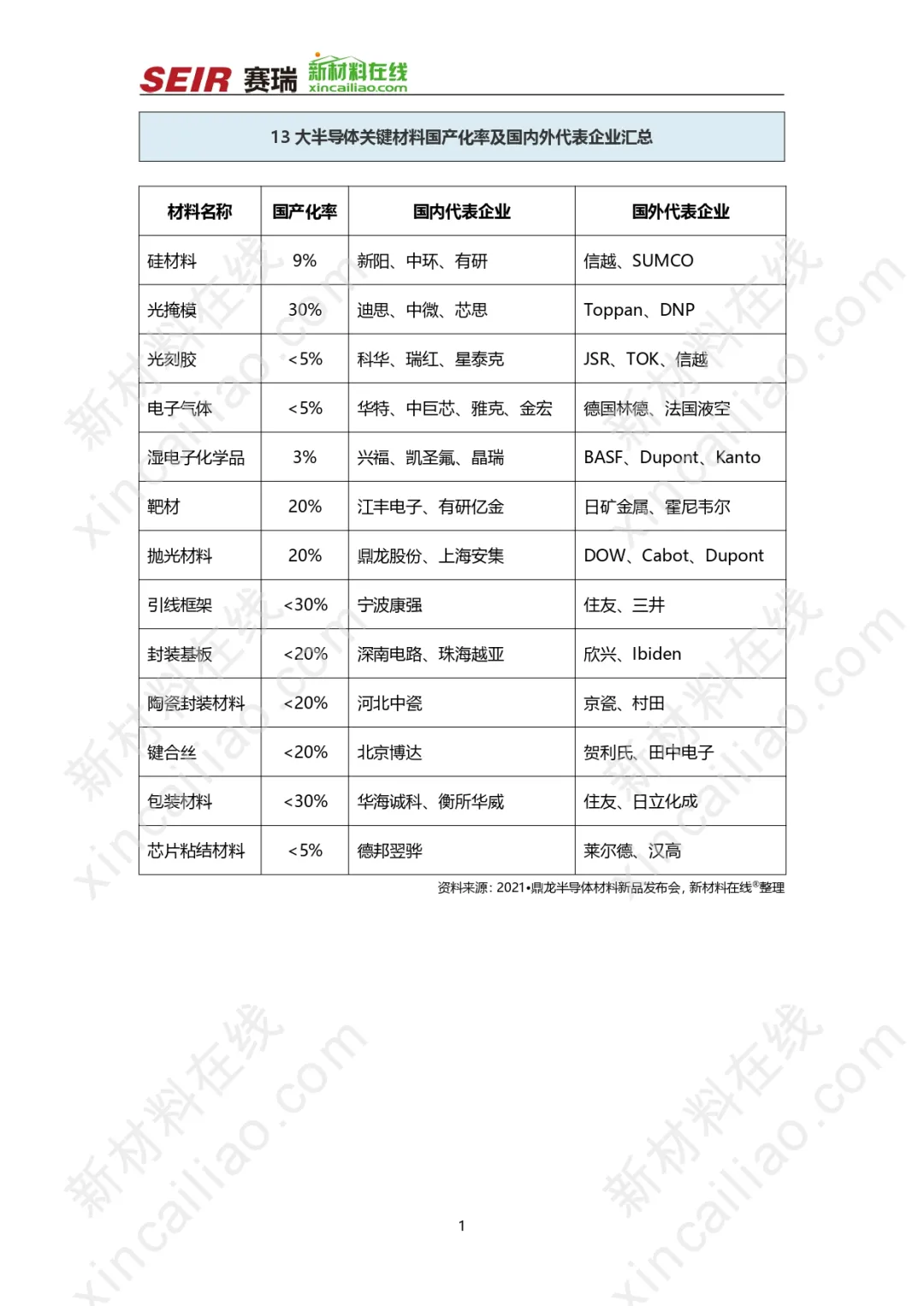 13大半导体关键材料国产化率及国内外代表企业汇总 |