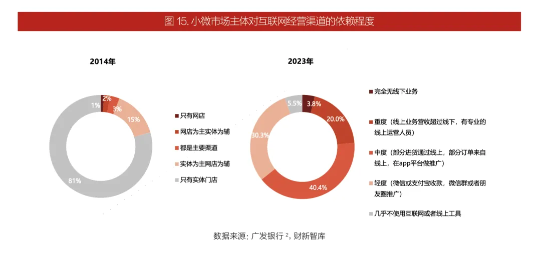 小微市场主体经营渠道逐渐向线上转移,相比2014年调研数据,10年间仅依靠线下实体经营的比例从81%大幅缩小到5.5%。