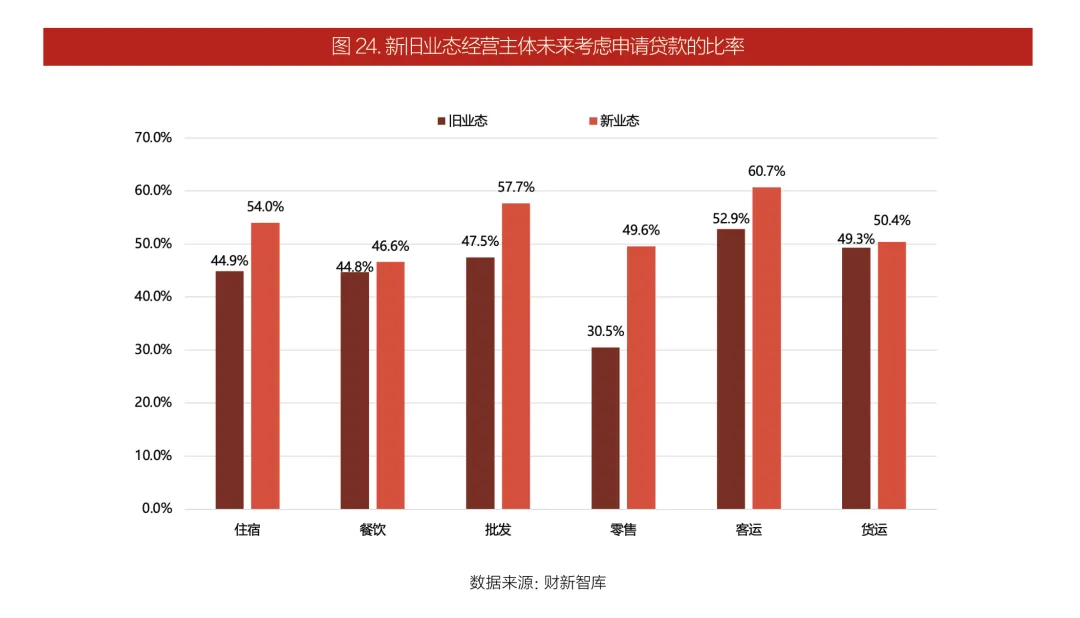服务业新业态贷款需求旺盛:48.6%的市场经营主体未来考虑申请贷款,新业态经营主体贷款意愿较旧业态高近10%。