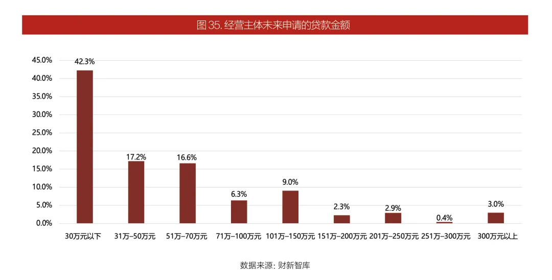 大部分小微市场主体的资金需求为小额需求。结合自身经营需求,76.1%的市场经营主体计划申请贷款金额在70万元以内,其中42.3%计划贷款金额在30万元以内。