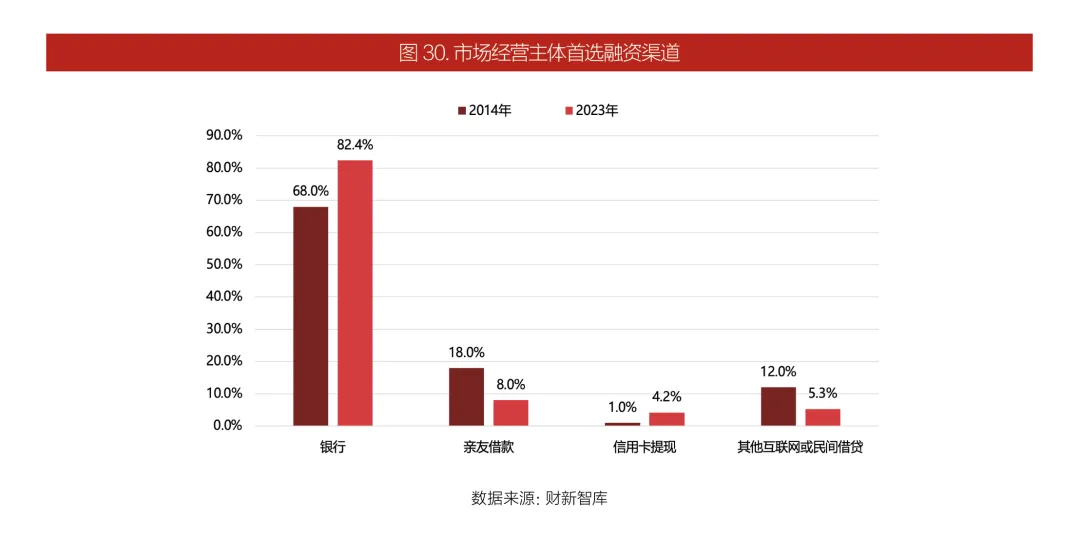 银行是82.4%的小微市场主体首选的贷款渠道。相比于2014年仅有68%的小微主体选择银行作为首选融资渠道,如今,银行的接受度大幅提高。