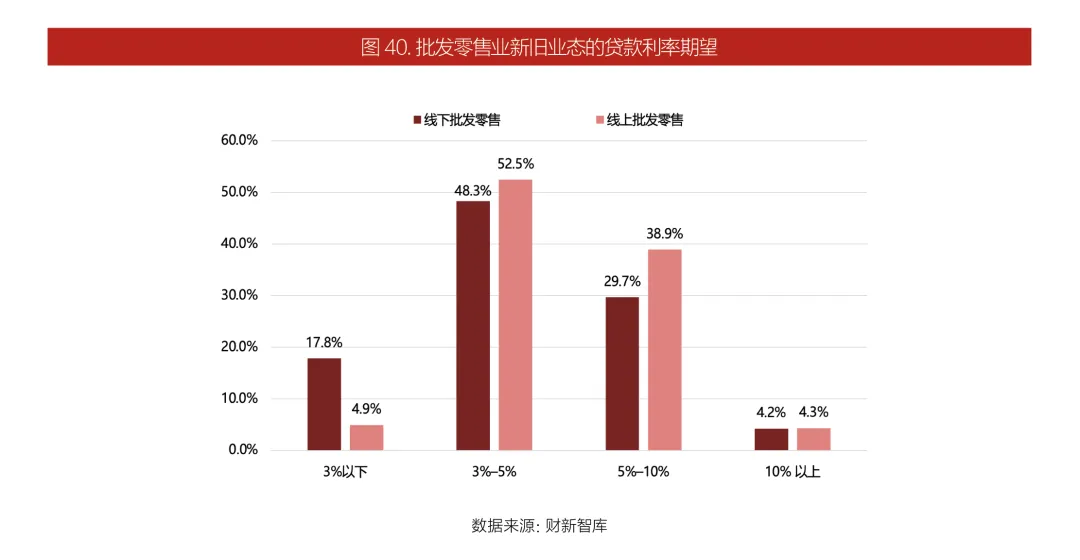 新业态经营主体更偏好线上贷款,批发零售、住宿餐饮行业新业态能够接受更高的贷款利率。分别有42.9%和34.0%的批发零售、住宿餐饮新业态经营者可以接受5%以上的贷款利率,高于旧业态中对应的样本占比(33.9%和29.1%)。