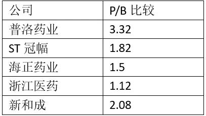 市净率计算是考虑到净资产的稳定性特征,并不像P/E一样展示了企业的盈利能力,但为了综合分析,我们也用此种方法对普洛药业和其他公司进行估计。