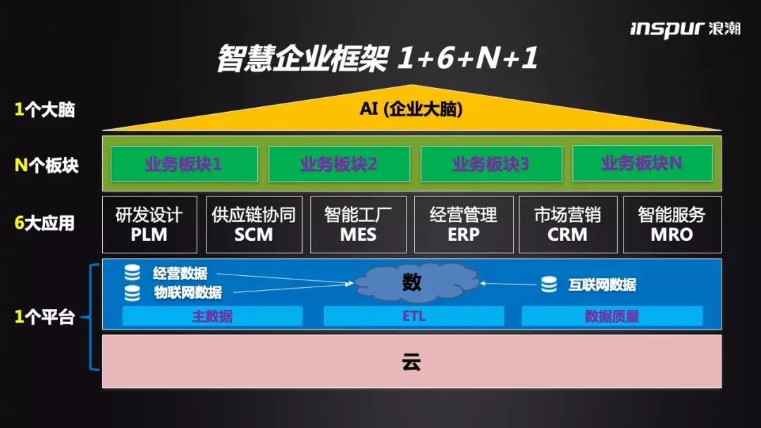 更重要的是,这种创新能力也让浪潮成功的探索和实践出了大型企业数字化转型的新路径与新模式。在今年的2019中国500强企业峰会上,浪潮集团董事长兼CEO孙丕恕就表示,数字化转型的目标是成就智慧企业,而基于多年的信息化实践,浪潮提出了“智慧企业框架”的新方法论,即通过云、数、智+应用构建企业大脑,由此为企业的数字化转型提供更大的支撑。