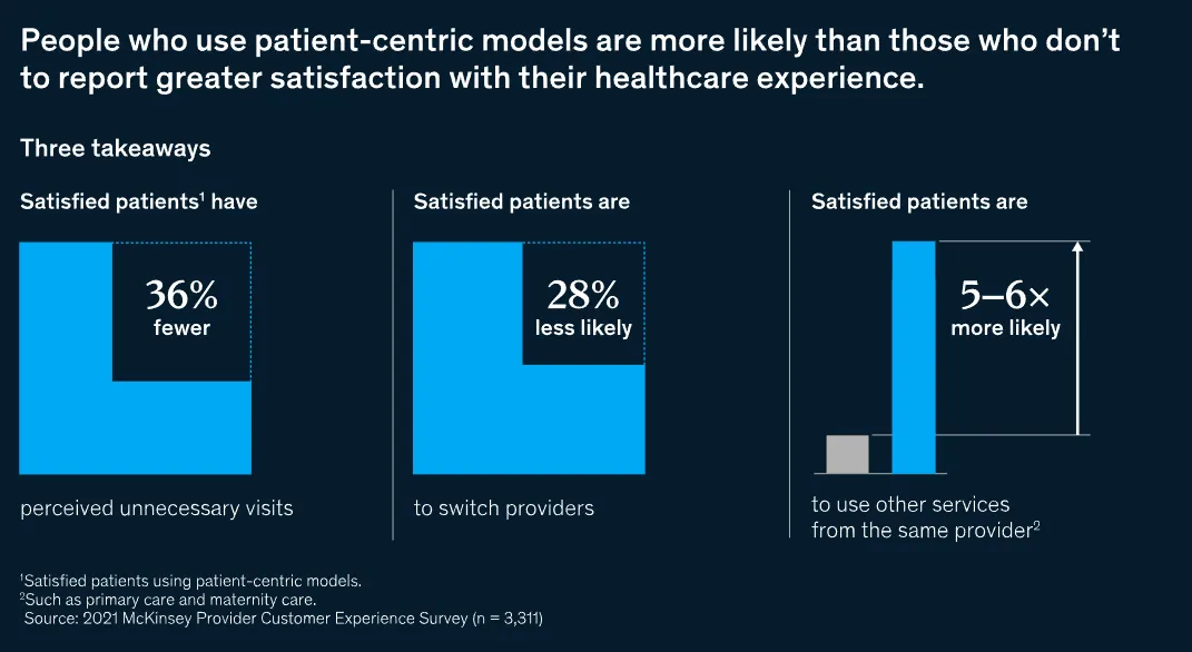以患者为中心的模式具有巨大的的经济效应。最近的一组调查显示,使用以患者为中心模式并感到满意的患者比不使用该模式的患者更换医疗机构的可能性低28%,且有高达5-6倍的可能使用同一个医疗机构的其它医疗服务。超过三分之一的患者还指出,在使用以患者为中心模式的医疗服后,患者减少了不必要的就诊。与此同时,满意的患者还感到更有能力参与自身健康改善,并感觉自己正在接受更好的护理,这有助于促进更好的健康结果。