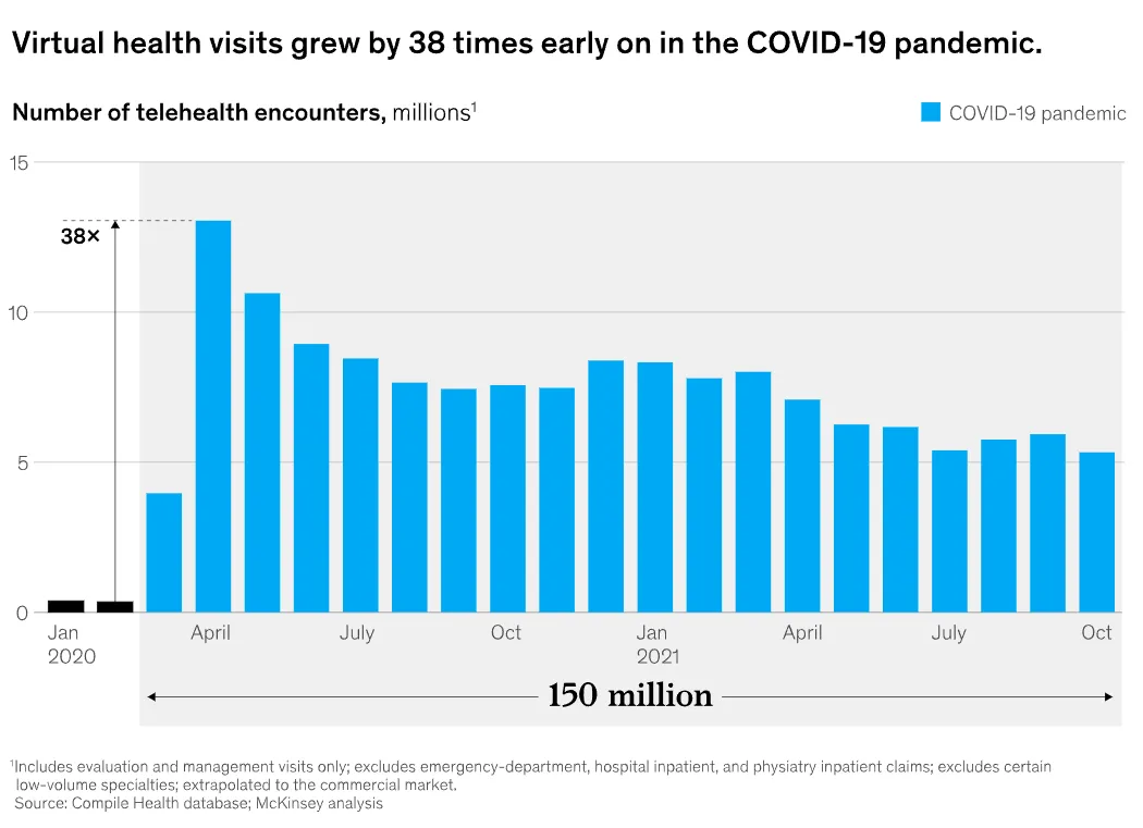 2020年3月以来,虚拟健康服务的使用率大幅增加。在新冠疫情早期,虚拟健康服务访问量增长了3000%以上,在不到两年的时间里,有1.5亿次远程健康索赔发生。