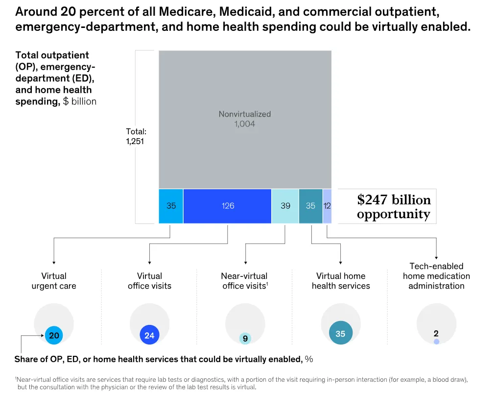 这些数字表明,虚拟护理有潜力在更广泛的范围刺激医疗服务创新,良好的消费者认知和持续的投资有助于远程医疗的持续增长。我们估计,大约2500亿美元的门诊支出可能会通过更多元的医疗模式(包括远程专业护理、虚拟护理和虚拟诊断)进一步转移到虚拟健康服务中。急症护理中的虚拟护理模式(包括远程ICU)与居家创新护理模式(如远程患者监护和家庭医院模式)相结合时,节省成本的潜力将大幅提升。