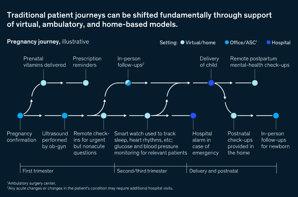 居家护理能力的扩展也可以吸引非医保的患者群体,许多技术支持的服务可能首先被乐于接受先进技术的患者采用。下图通过“妊娠护理全流程”来具体说明远程护理、非住院护理和居家模式如何从根本上改变传统的患者全流程。