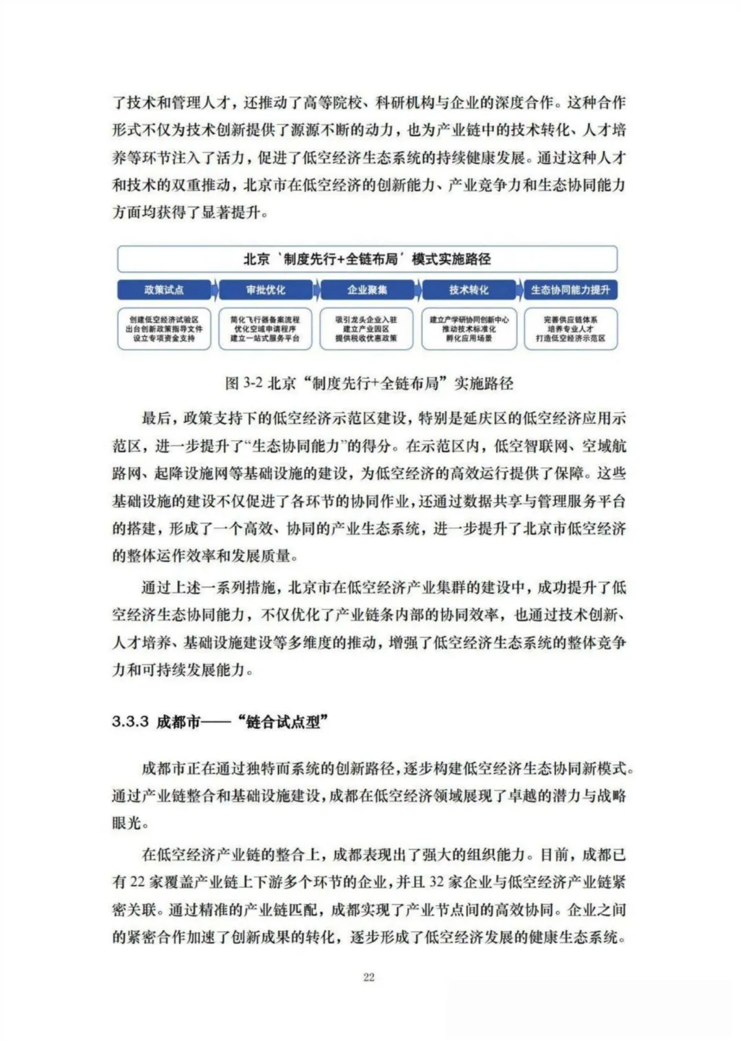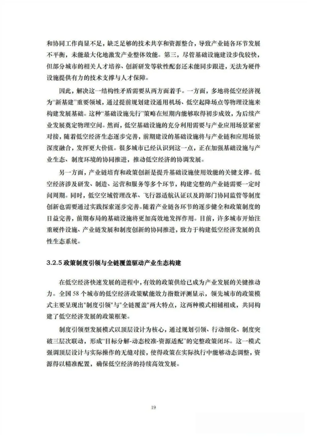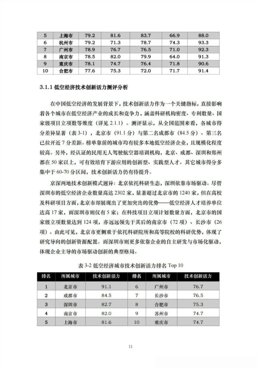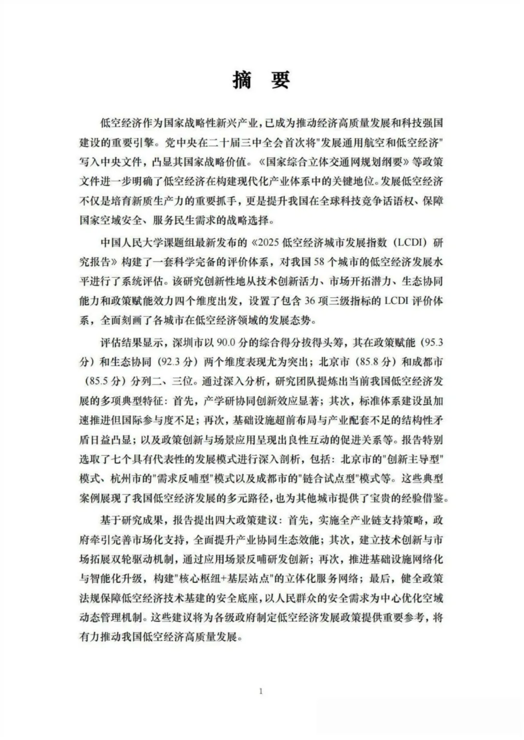 导读:报告构建技术创新、市场开拓、生态协同、政策赋能四大维度的 LCDI 评价体系,为产业发展提供参考。低空经济作为国家战略性新兴产业,涵盖航空器研发制造、基础设施建设、多元场景应用等完整产业链,已形成万亿级市场潜力。测评结果显示,深圳、北京、成都位列综合排名前三,分别代表政策全链覆盖、科研生态协同、链合试点驱动的发展模式。各地呈现产学研协同创新突出、标准建设加速、应用场景驱动制度创新等特征,但也存在基础设施与产业配套失衡、国际标准参与不足等问题。报告提出四大政策建议,包括全产业链协同支持、技术与市场双轮驱动、基础设施网络化升级、筑牢安全与制度保障底座。典型城市案例展现多元发展路径,为各地因地制宜布局低空经济提供实践借鉴。