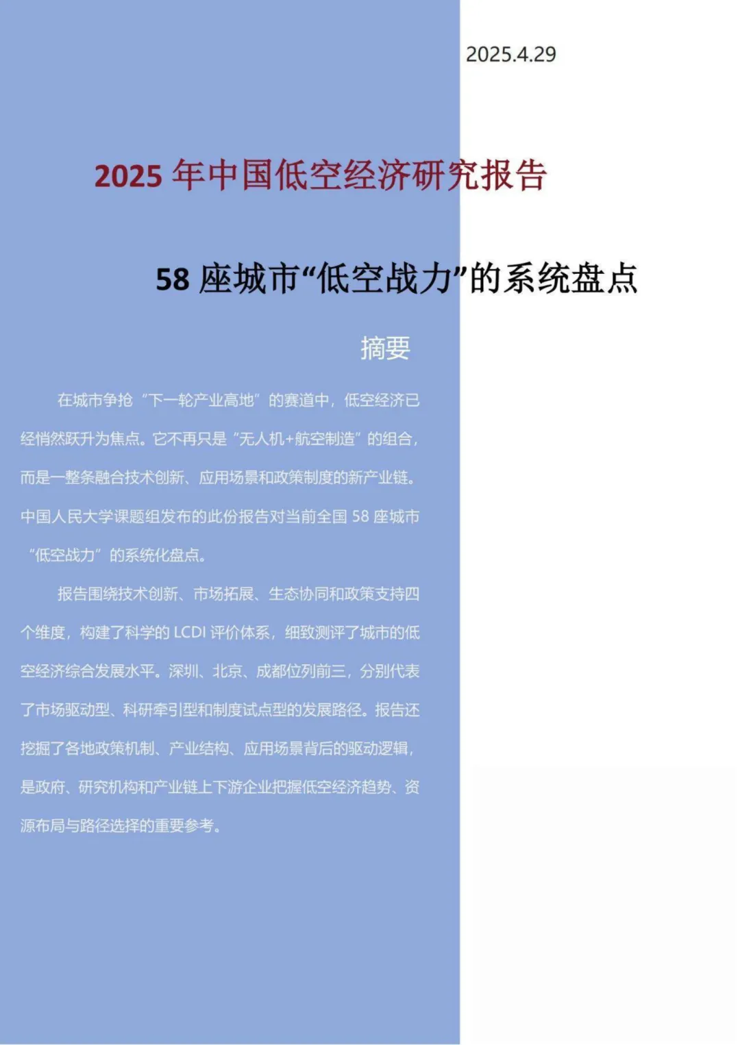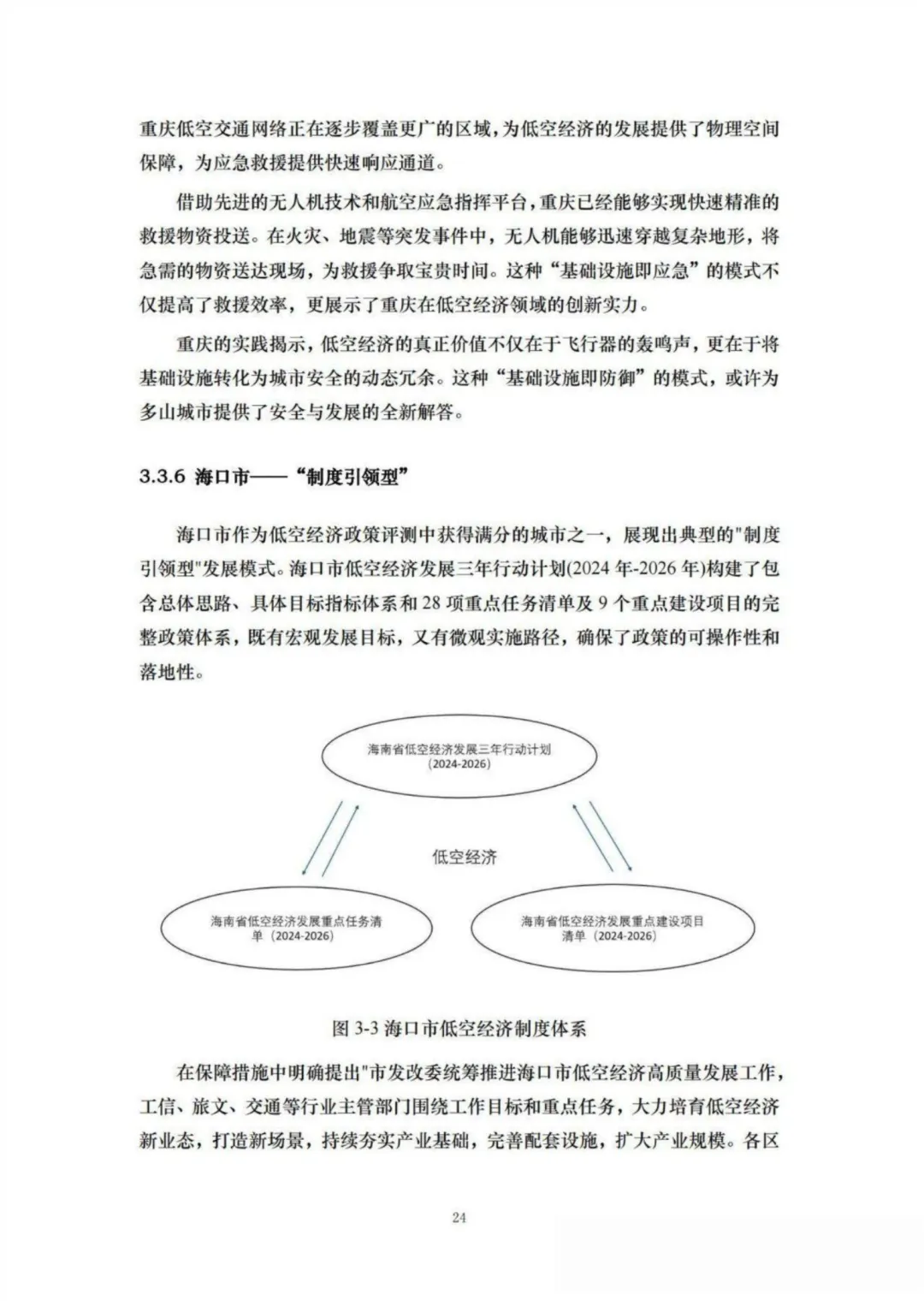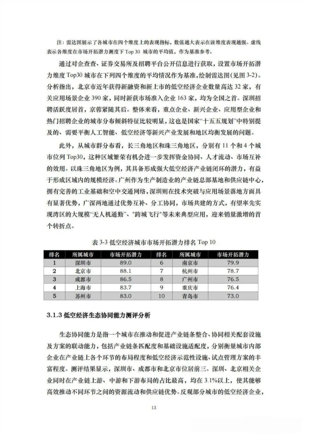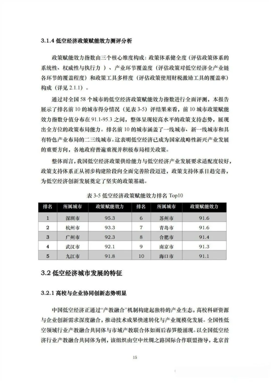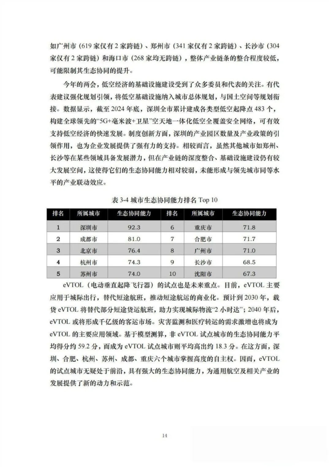 导读:报告构建技术创新、市场开拓、生态协同、政策赋能四大维度的 LCDI 评价体系,为产业发展提供参考。低空经济作为国家战略性新兴产业,涵盖航空器研发制造、基础设施建设、多元场景应用等完整产业链,已形成万亿级市场潜力。测评结果显示,深圳、北京、成都位列综合排名前三,分别代表政策全链覆盖、科研生态协同、链合试点驱动的发展模式。各地呈现产学研协同创新突出、标准建设加速、应用场景驱动制度创新等特征,但也存在基础设施与产业配套失衡、国际标准参与不足等问题。报告提出四大政策建议,包括全产业链协同支持、技术与市场双轮驱动、基础设施网络化升级、筑牢安全与制度保障底座。典型城市案例展现多元发展路径,为各地因地制宜布局低空经济提供实践借鉴。