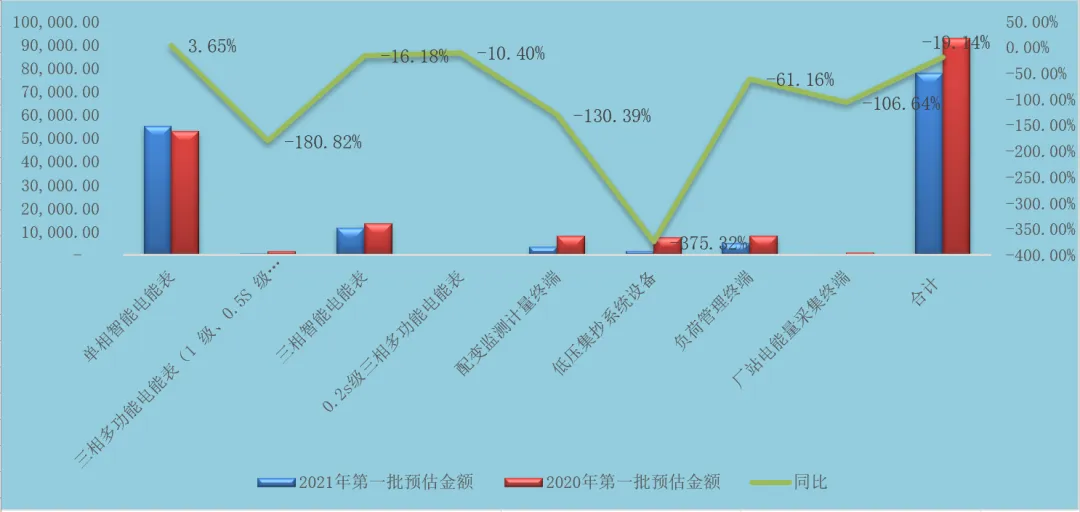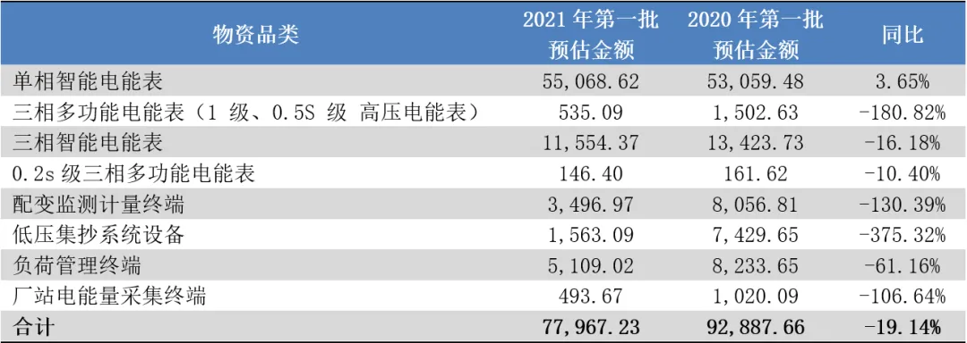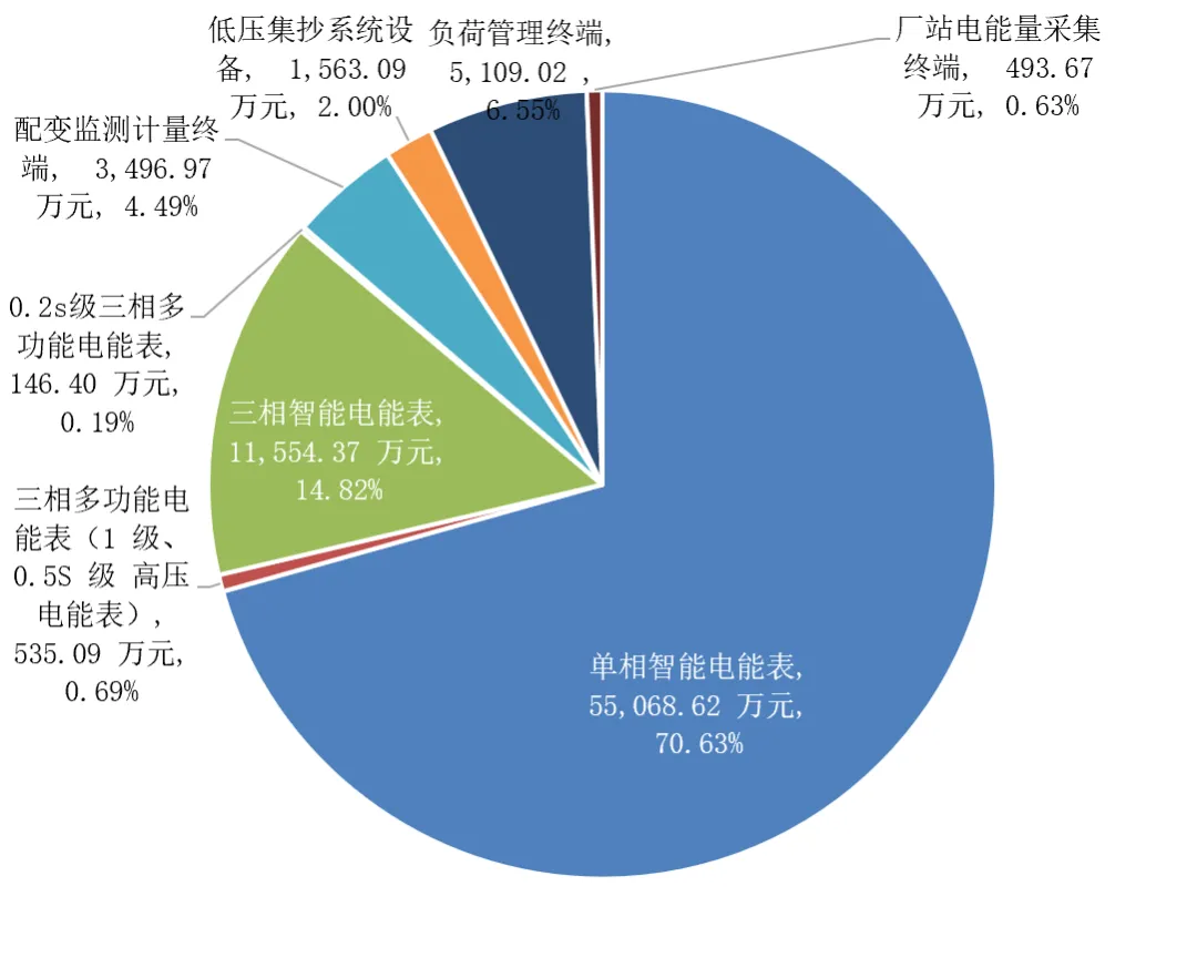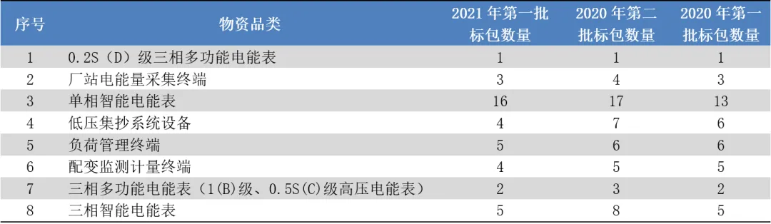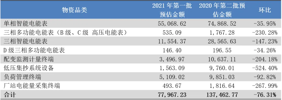 各物资品类的投资金额占比来看,单相智能电能表的投资金额预计占比70.63%,环比2020年第二次招标增加了16.17个百分点,是本次招标项目的主要需求来源;而其他物资的需求占比大多下降。