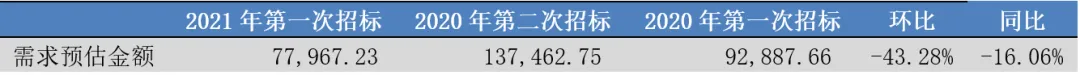 根据分包情况,中标企业理论最大中标金额可达到12,304.5万元,占比可达到15.78%。从理论中标金额来看,本次招标比2020年第二批的理论最大中标金额减少10,140万元;从占比来看,本次招标比2020年第二批理论最大中标金额占比低0.55个百分点。