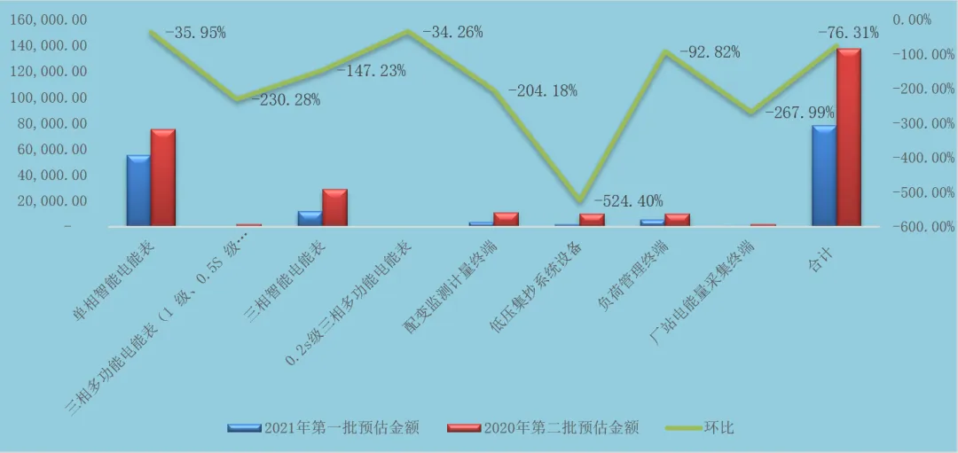 具体到各物资品类,本次招标全部8个品类的投资金额环比都大幅度下降,下降幅度最大的是低压集抄系统设备,达到-524.40%;单相智能电能表下降幅度相对较小,但也达到了-35.95%。