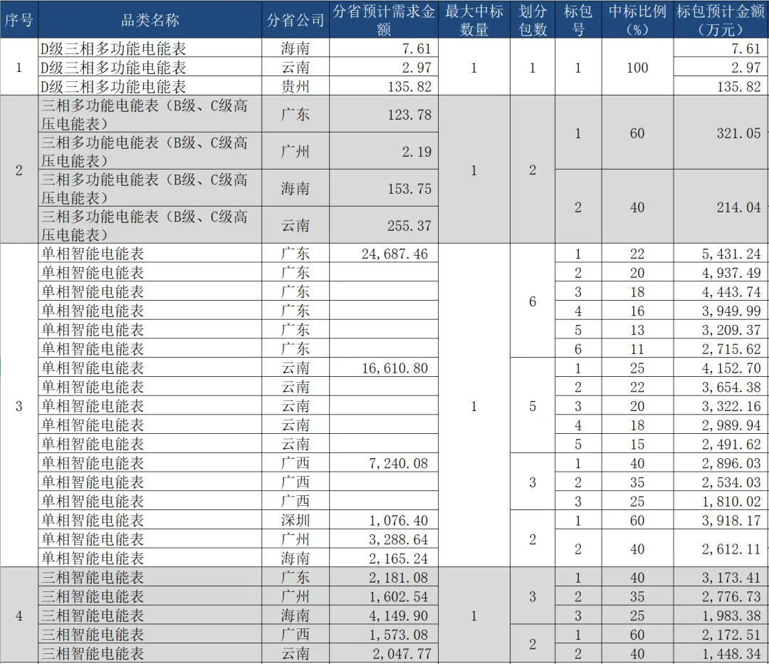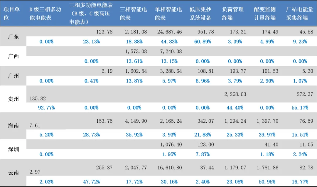 单相智能电能表:广东需求量最大,占比44.83%;主要来源于云南、广西,需求量占比都超过10%。