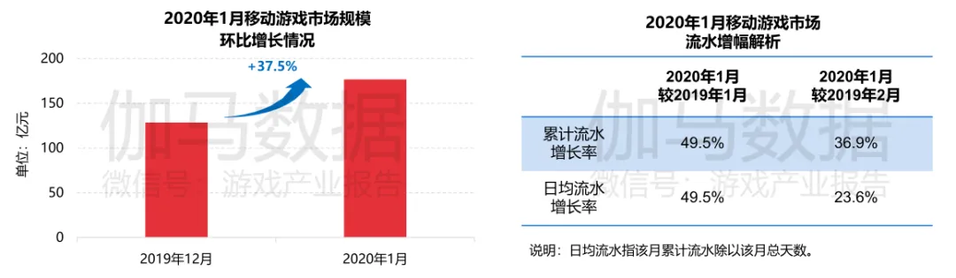 近日,伽马数据发布了《2020年一月移动游戏报告》。根据数据显示,2020年1月,中国移动游戏市场规模环比上涨超3成,较之去年同期(2019年1月),增长49.5%;环比(较之2019年12月)增37.5%。2020年春节期间(1月)较之去年同期(2月),增长率达36.9,消除2月天数劣势增长率达23.6%。