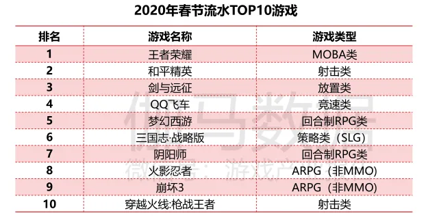 此外,《剑与远征》登上春节流水TOP榜来到第3名的位置,其余7名依次为《QQ飞车》、《梦幻西游》、《三国志·战略版》、《阴阳师》、《火影忍者》、《崩坏3》以及《穿越火线:枪战王者》。