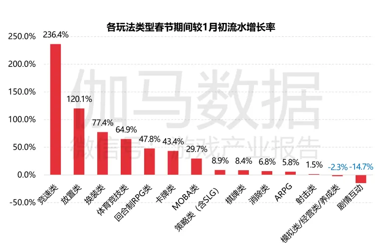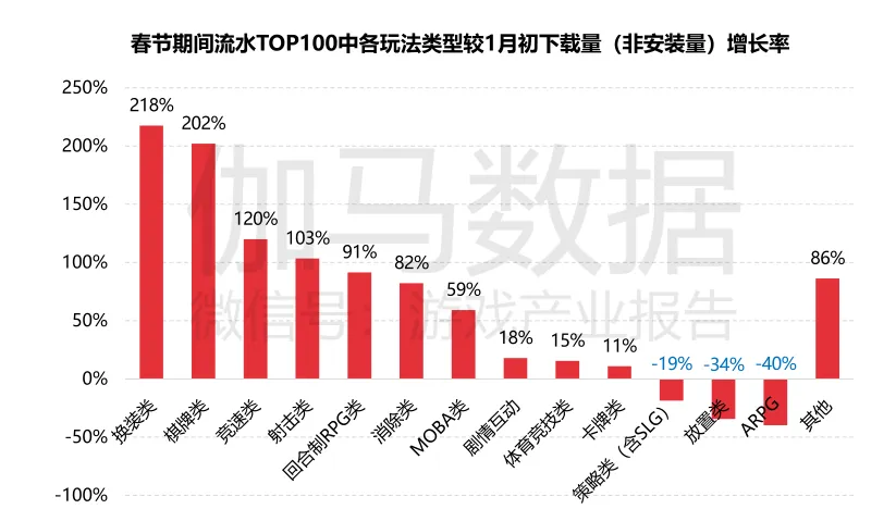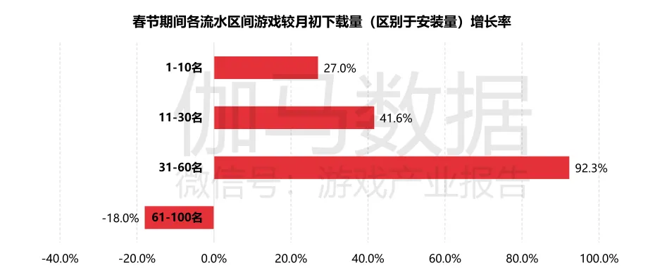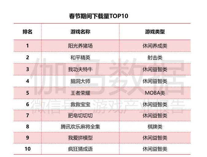 除了竞速类和放置类游戏外,换装、体育竞技等类别均由部分产品推动实现高流水增长,但女性向游戏较多的剧情互动类玩法春节期间流水较1月初则出现了一定的负增长。春节期间各区间游戏流水向头部聚集,TOP10增长明显2020年春节受环境因素影响,国内市场流量得到充分挖掘,致使市场流水同比出现较大幅度增长,并且头部产品均为拥有较高流量的中重度游戏,随着春节期间亲友互动频率的增加,产品口碑传播能力随之升级,致使部分产品基础流量发挥更高传播效果,流水增长明显。据报告称,流水TOP10产品流水较月初增长超30%,同比增长超50%,这主要受益于2020年《和平精英》、《剑与远征》等爆款游戏的出现,劳动了头部产品的整体量级。同时,TOP10之外的产品较月初与2019年同期也均出现了较高幅度的增长。从春节期间流水TOP100中各种玩法类型较1月初的新增下载量增长率来看,换装、棋牌类游戏出现爆发式增长;竞速类新增下载量同样实现翻倍,其中《跑跑卡丁车官方竞速版》通过买量效果明显,春节期间下载量增长超3倍;射击类、回合制RPG等强社交性产品也近翻倍的新增下载量。但是策略、放置、ARPG类游戏则出现不同程度的放入增长,其中《剑与远征》上线于2020年1月初,当期下载量较高,因此,春节期间新增下载量出现负增长。春节期间各流水区间游戏较月初下载量TOP100的产品中,60名以前的产品下载量增长明显,其中31-60名增长较高,主要由于棋牌类游戏处于这一区间,其中《腾讯欢乐麻将全集》下载量增长超3倍,而61-100名新增下载量反而低于月初,流量获取上呈现被动。从春节期间所有游戏下载量头部产品来看,休闲益智类是春节期间最热门的品类,下载量TOP10中休闲益智类产品占比达70%,另外三款则是射击类游戏《和平精英》、MOBA类游戏《王者荣耀》以及棋牌类游戏《腾讯换了麻将全集》。休闲游戏的爆发一定程度上受到视频奖励广告对其商业化模式的影响,下载量TOP10中的7款休闲游戏均有植入奖励式视频广告,也均在视频奖励广告渠道中进行买量。其中《阳光养猪场》在春节期间广告投放量最大,远高于《剑与远征》、《三国志·战略版》等中重度游戏。■