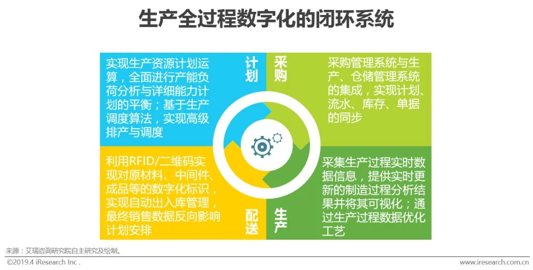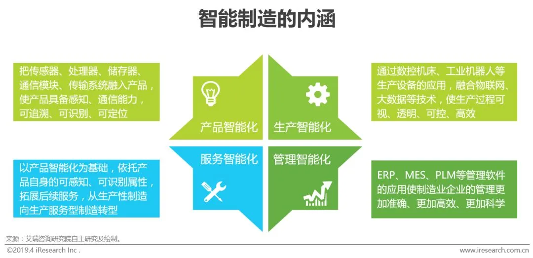艾瑞认为,智能制造是通过新一代信息技术、自动化技术、工业软件及现代管理思想在制造企业全领域、全流程的系统应用而产生的一种全新的生产方式。智能制造的应用能够使制造业企业实现生产智能化、管理智能化、服务智能化与产品智能化。