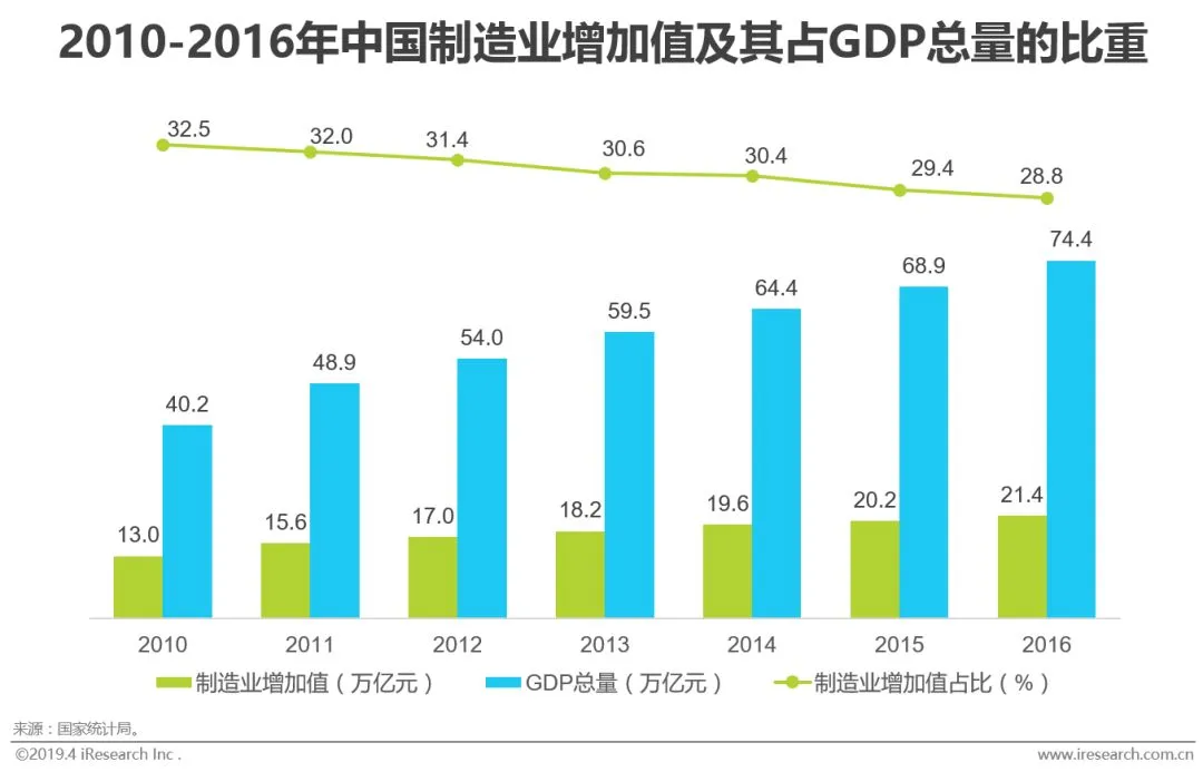 近年来,中国的经济发展已由高速增长阶段逐步转入高质量发展阶段,政府更加关注于优化经济结构、转换增长动力。制造业是供给侧结构性改革的主要领域,尽管制造业增加值在全国GDP总量中的比重呈下降态势,但以制造业为代表的实体经济才是中国经济高质量发展的核心支撑力量。2015-2016年,中国制造业增加值的同比增速仅为3.5%和5.9%,原料、土地、人力资源等生产要素成本的不断上涨使制造业本就不高的利润率很难提升。提高质量效益、转变生产方式是中国制造业必须要解决的问题,而发展智能制造正是中国制造由大到强的必由之路。