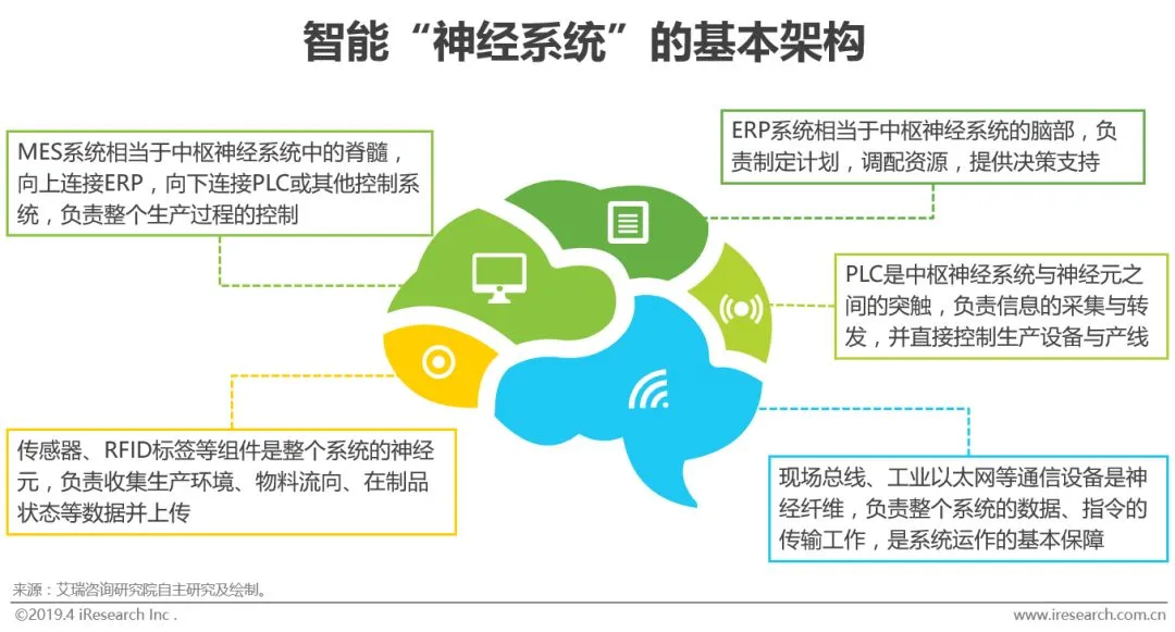 智能制造是一种可以让企业在研发、生产、管理、服务等方面变得更加“聪明”的方法,我们可以把制造智能化理解为企业在引入数控机床、机器人等生产设备并实现生产自动化的基础上,再搭建一套精密的“神经系统”。智能“神经系统”以ERP(企业资源计划系统)、MES(生产过程执行系统)等管理软件组成中枢神经,以传感器、嵌入式芯片、RFID标签、条码等组件为神经元,以PLC(可编程逻辑控制器)为链接控制神经元的突触,以现场总线、工业以太网、NB-IoT等通信技术为神经纤维。企业能够借助完善的“神经系统”感知环境、获取信息、传递指令,以此实现科学决策、智能设计、合理排产,提升设备使用率,监控设备状态,指导设备运行,让自动化生产设备如臂使指。